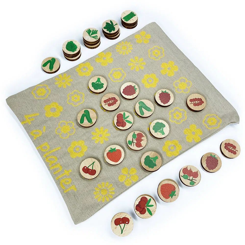 L’éveil des enfants à la nature est au cœur de notre mission chez Sloli. Avec « 4 à planter », les fruits rouges et les légumes verts n’auront plus de secrets pour vous ! Ce jeu de société durable et ludique permet aux enfants de découvrir en s’amusant 12 fruits et légumes délicieux : 6 fruits rouges et 6 légumes verts. Chacun des fruits et légumes du jeu est présent en 3 exemplaires sur 3 pions différents, ce qui fait un total de 36 pions.