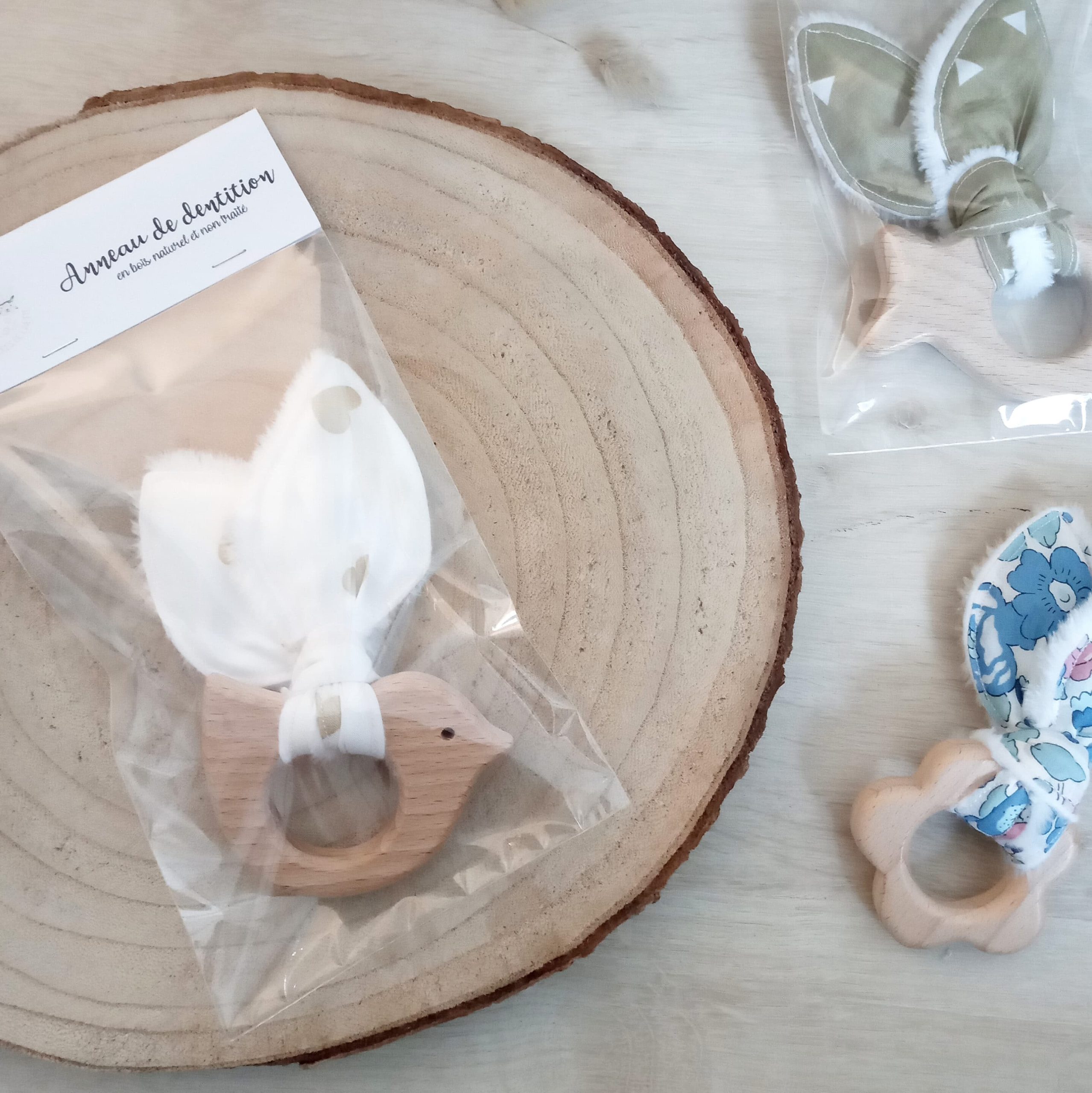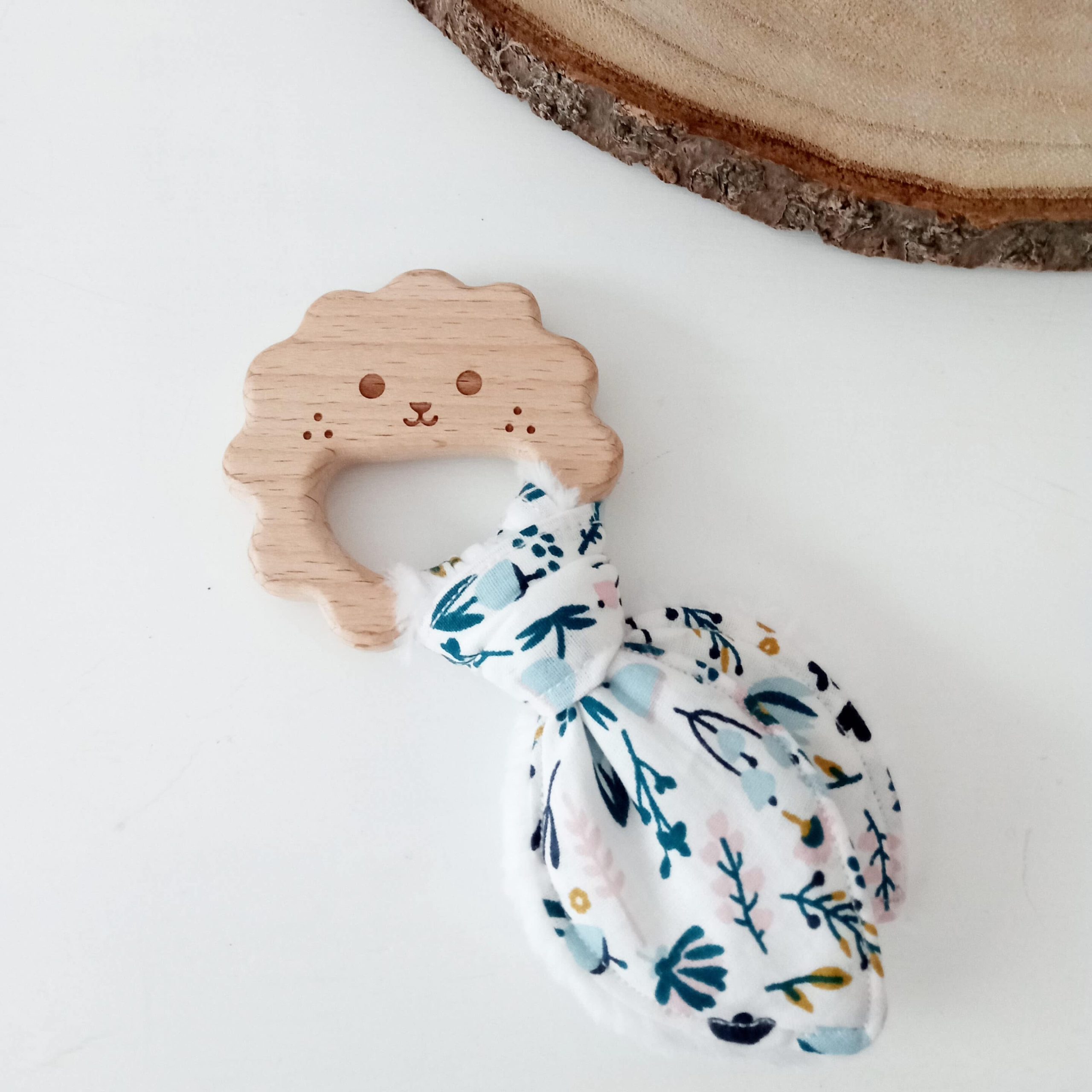Anneau de dentition en bois de hêtre non traité. Oreilles toutes douces en coton et tissu doudou (50% coton 50% polyester).