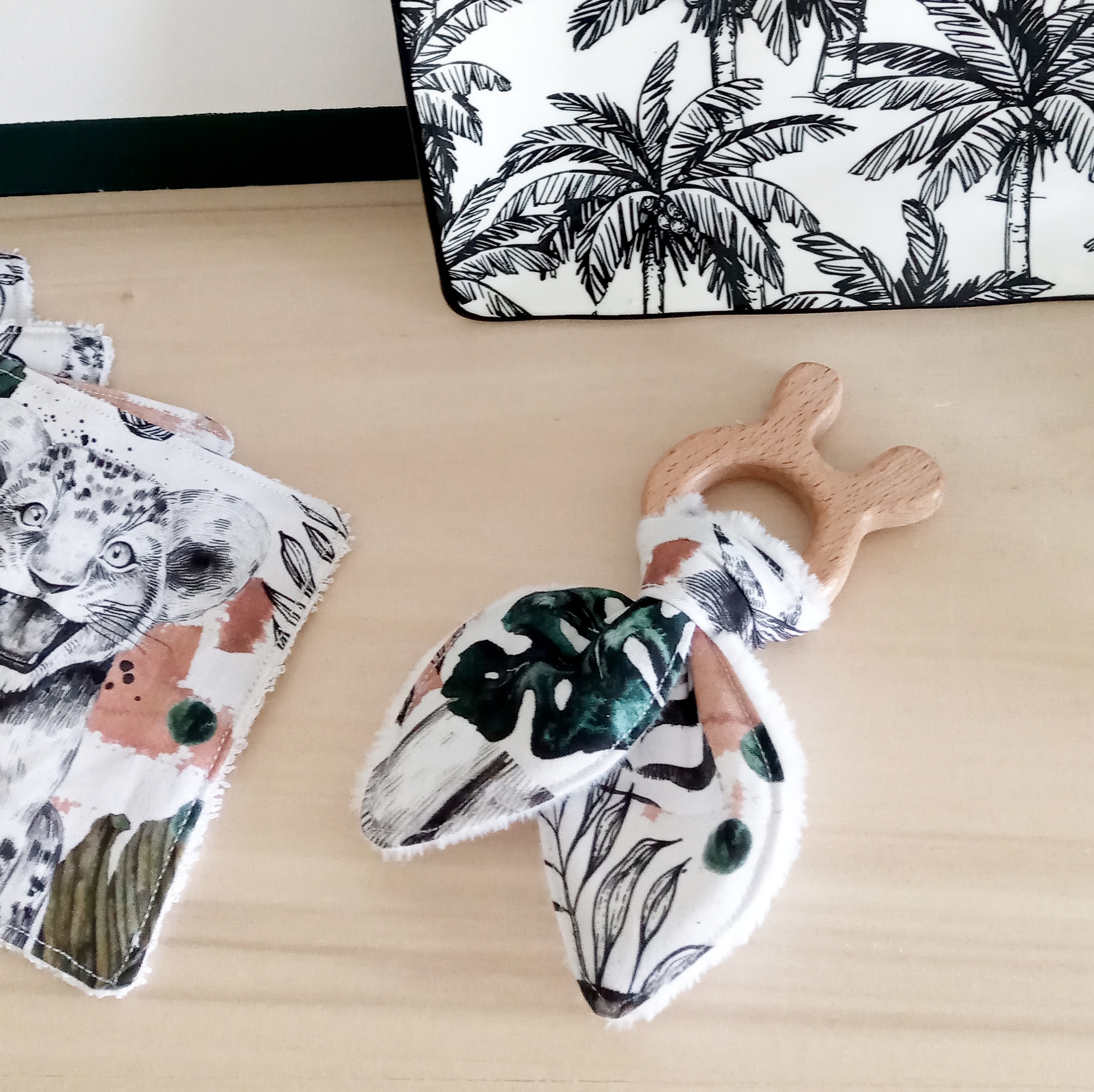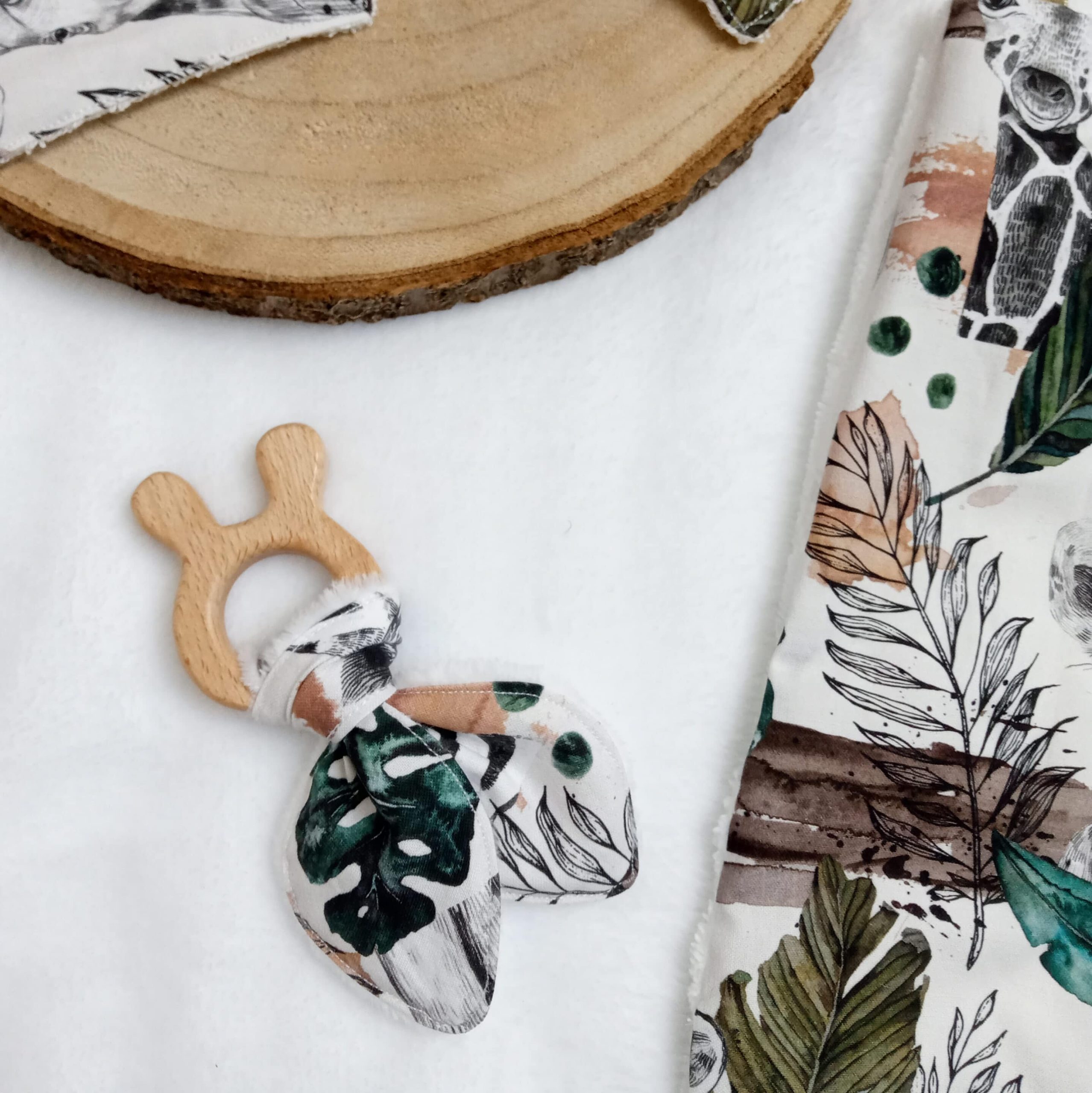 Anneau de dentition en bois de hêtre non traité. Oreilles toutes douces en coton et tissu doudou (50% coton 50% polyester).