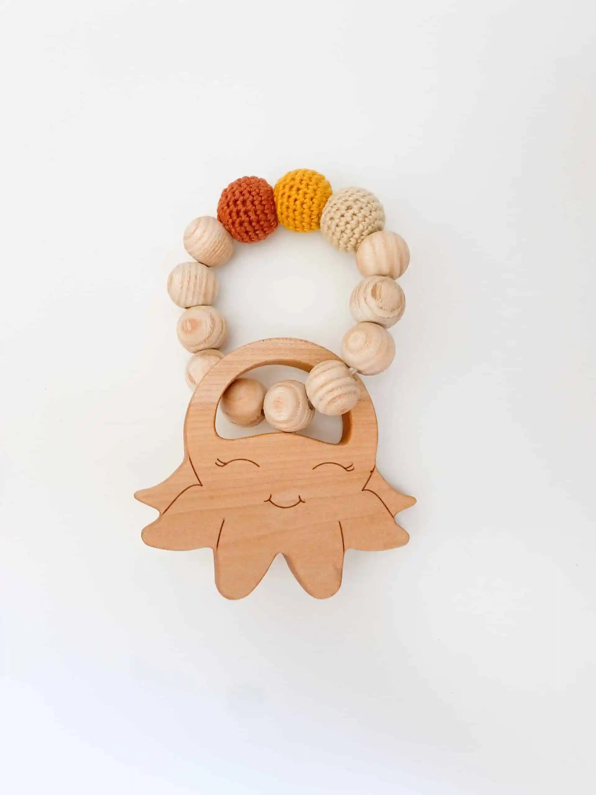 Composition : Anneau de dentition avec des perles en coton biologique et en bois naturel vernis à l’huile d’olive.