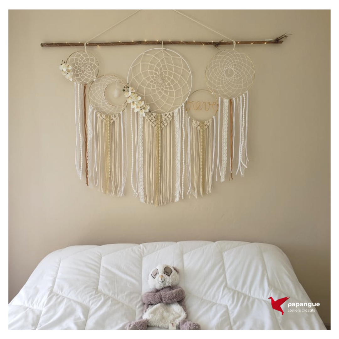 Un attrape-rêves géant, unique et lumineux, d’inspiration bohème chic et mariage. Parfait pour une pièce à vivre ou dans une chambre en tête de lit lumineux. Créé dans des tons de couleurs claires, blanc, beige, doré. Branche de bambou naturel vernis. Lumières LED avec pile. Possibilité de création personnalisable et sur mesure (format, couleurs, motifs; […]