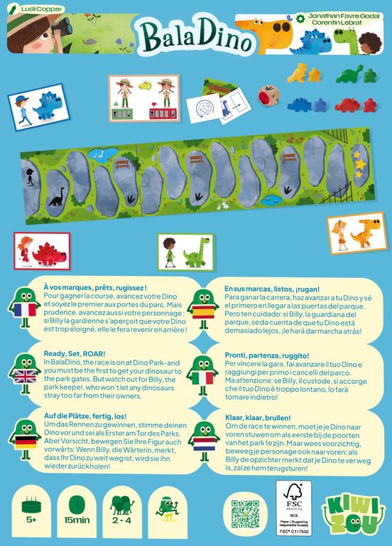 C’est jour de balade à Dino Parc ! Les maîtres sont de sortie, accompagnés de leur fidèle Dino de compagnie. Très vite une compétition s’organise : quel Dino sera le plus rapide à atteindre les grilles du parc ? Tout ce petit monde prend le départ sur l’allée centrale mais attention à Billy, la gardienne du parc, qui veille et qui ne supporte pas de voir les Dinos trop loin devant leur maître ! Une douce initiation à la prise de risque. Dans ce jeu de course original, les joueurs doivent gérer 2 pions : leur pion maitre et leur pion Dino. Pour gagner…