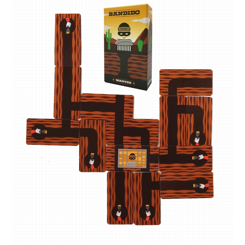 Arrêtez-le ! But du jeu : Il senfuit par des tunnels sous sa cellule. Essayez ensemble de lui bloquer toutes les sorties ! Règle : Place au centre de la table la super-carte de départ avec ses 6 sorties. Distribue 3 cartes à chaque joueur. A ton tour, joue une de tes cartes en la connectant aux tunnels existants, et si possible en réduisant le nombre total de sorties ! Re-pioche une nouvelle carte. Si toutes les issues sont bloquées avant que la pile soit épuisée, vous avez tous gagné sinon, viva bandido ! Contenu : 70 cartes, 1 super-carte, 1 règle de…