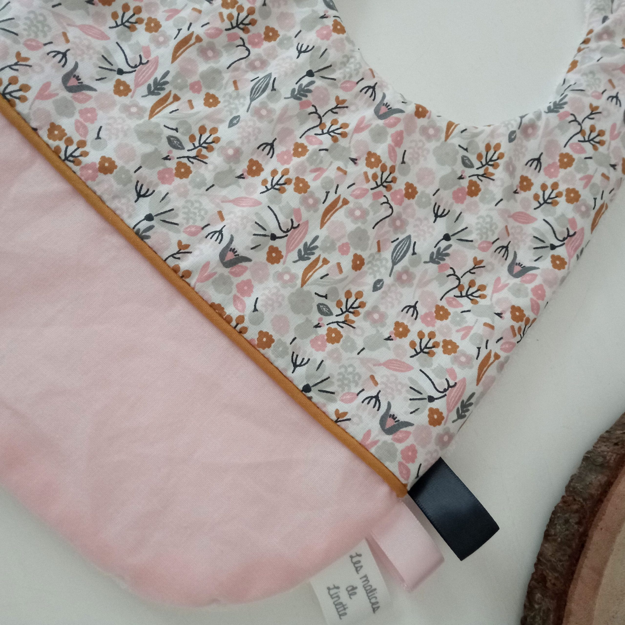 Bavoir, fleuri rose et curry et uni rose pâle passepoil curry
