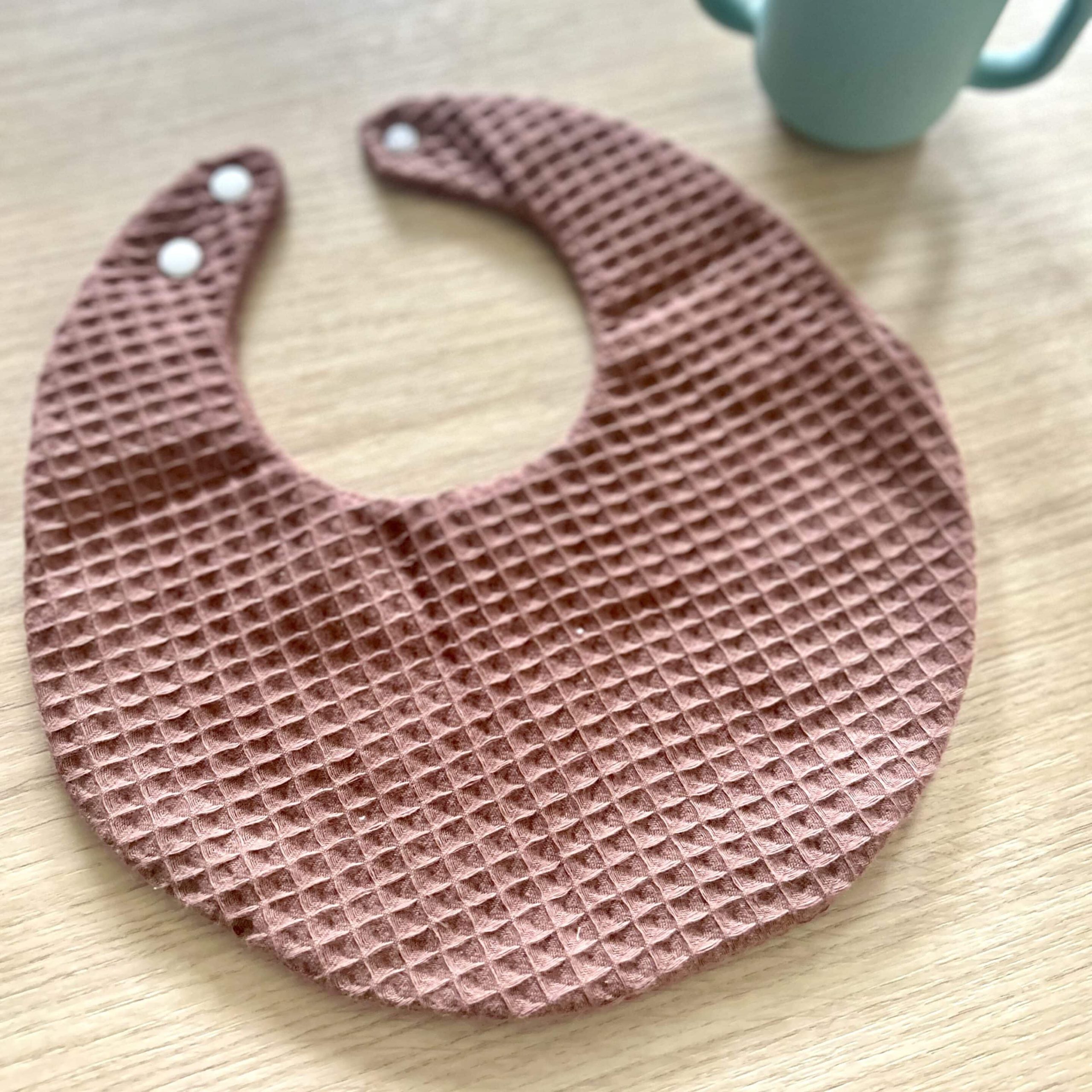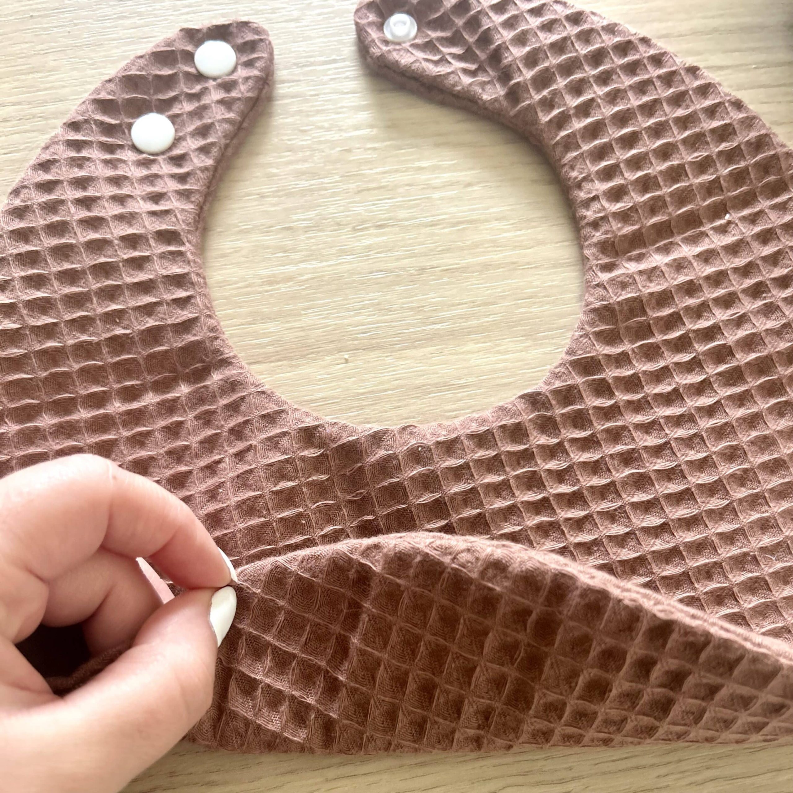 Bavoir en éponge nid d’abeille châtaigne recto verso.