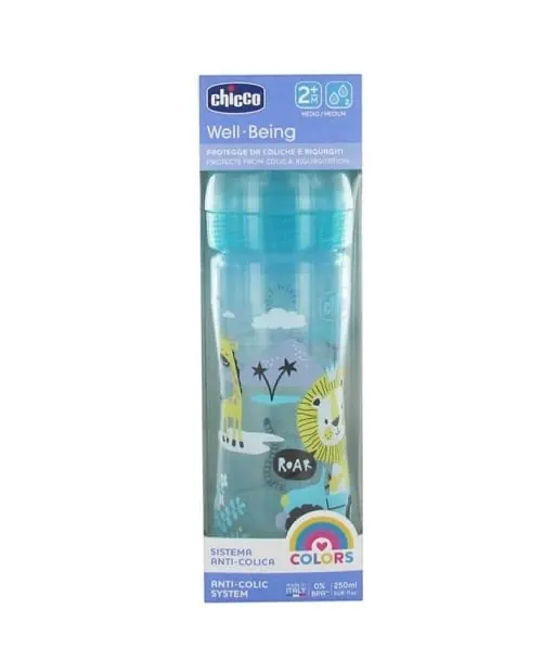 Biberon Plastique Bleu Chicco 250ml. A partir de 2mois et + Anti-Cholique. Chicco Biberon Well-Being avec Tétine silicone Bleue. Biberon plastique (Polypropylène), matière 0% BPA, Incassable, décors ludiques et gais, Tétine physiologique en silicone avec valve anti-colique. Capuchon anti-fuite, Col large pour un nettoyage et un remplissage simplifiés. Compatible avec toutes les tétines physiologiques Chicco. La Valve anti-cholique assure un flux d’air constant et régulier pendant la tétée, réduisant ainsi les risques de coliques, de régurgitation et de hoquet. L’anneau de relief augmentent l’élasticité de la tétine tout en reproduisant la sensation du sein maternel. La base large assure un meilleur appui des lèvres de l’enfant et aide la succion. La forme ergonomique permet une prise en main facile par l’enfant et les parents. Le Biberon Plastique Bleu Chicco 250ml permet de choisir le flux le plus adapté aux besoins de votre enfant en plaçant le numéro correspondant en face de son petit nez : 1 = Flux normal, 2 = Flux moyen, 3 = Flux rapide