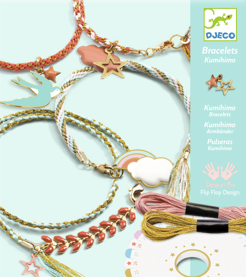 Découvrez les bracelets Céleste de Djeco, une activité créative dès 6 ans pour réaliser des bracelets Kumihimo, une technique de tressage circulaire venant du Japon. Votre fille va pouvoir réaliser de magnifique bracelets avec des harmonies de fils spécialement choisie et des breloques illustrées pour agrémenter ses bracelets. Ce coffret contient un outil de tressage en mousse, des échevettes de fils, des breloques et pendentifs, des anneaux souples ouverts et 1 livret d’exemples en couleurs. Tout un univers de création dédié aux filles : une boîte cadeau qui fera fondre les petites comme le plus grandes et des réalisations dont elles seront vraiment très…