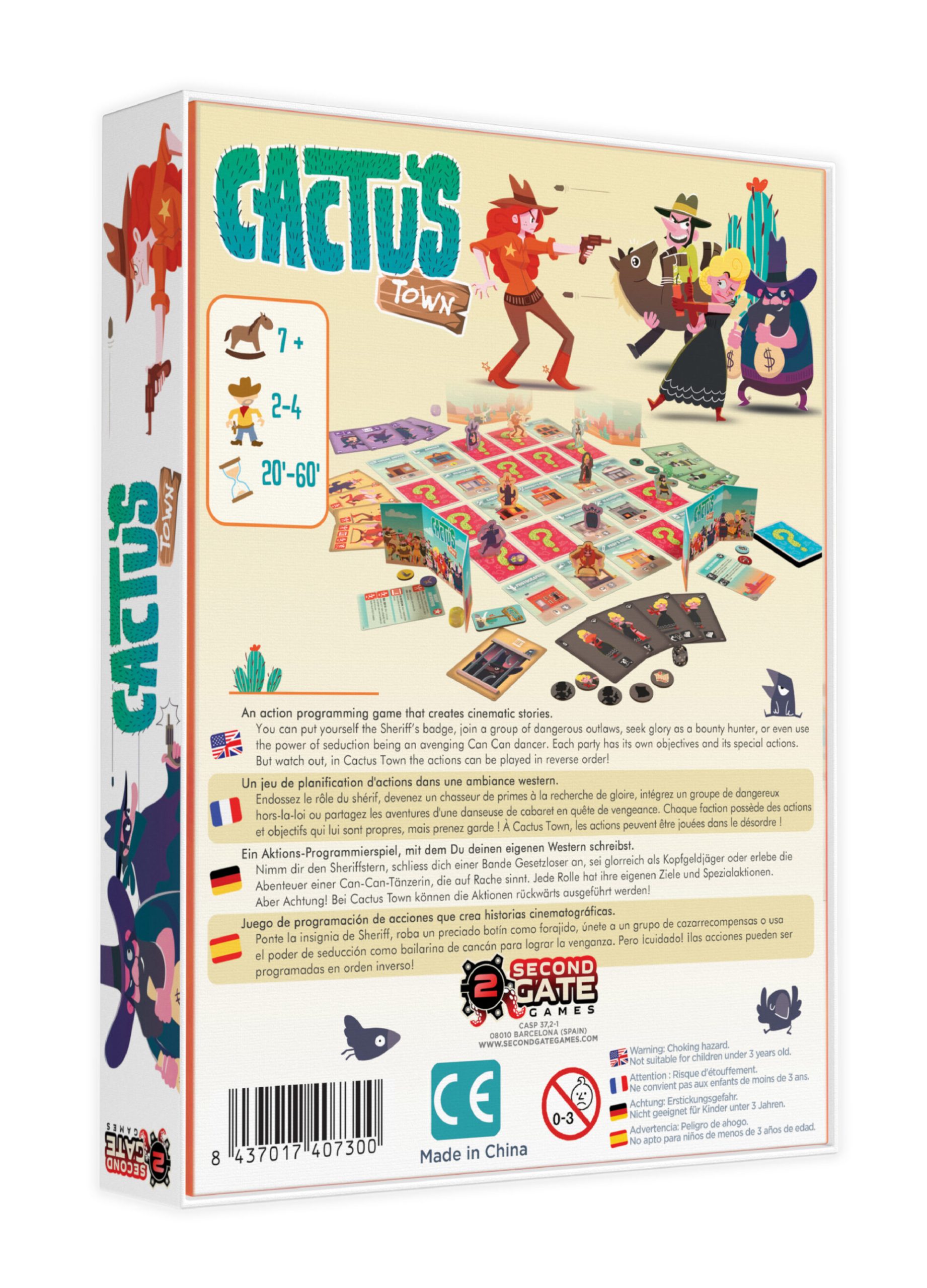 Cactus town se joue sur un plateau composé de cartes face cachées : la banque, le saloon, le barbier… Chaque faction aura un objectif pour gagner, qui peut être de piller l’un des lieux et de prendre la fuite, de capturer les malfrats ou encore de voler des chevaux. Chaque joueur a le même nombre de cartes en main, mais chacun a des actions disponibles différentes selon le ou les personnages joués. Il faudra programmer trois tours d’avance en jouant ces cartes face cachée. Déjouez les plans de vos adversaires, réalisez votre objectif, prenez part aux duels… Et longue vie…