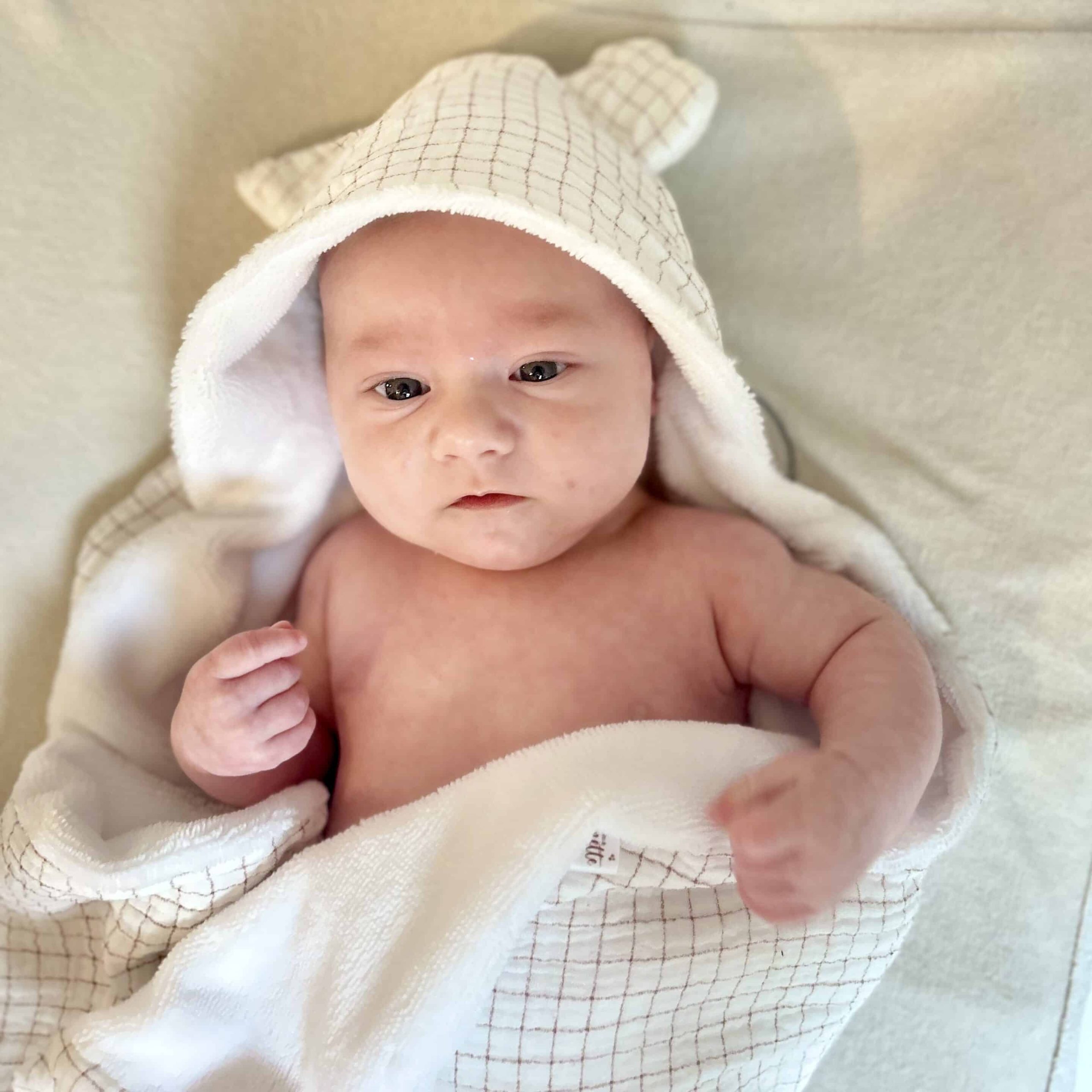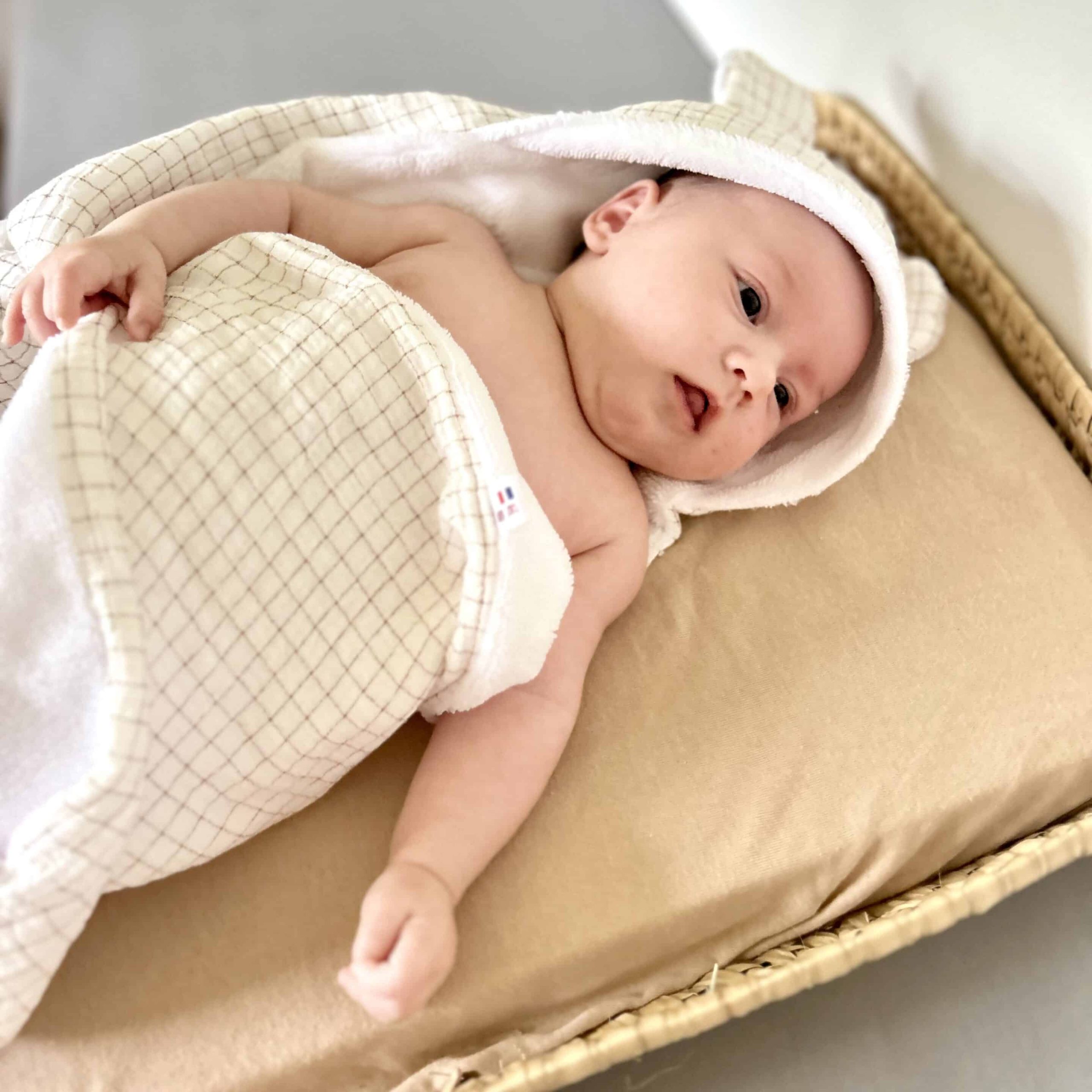 Cape de bain en éponge de bambou doudou et tissu double gaze de coton