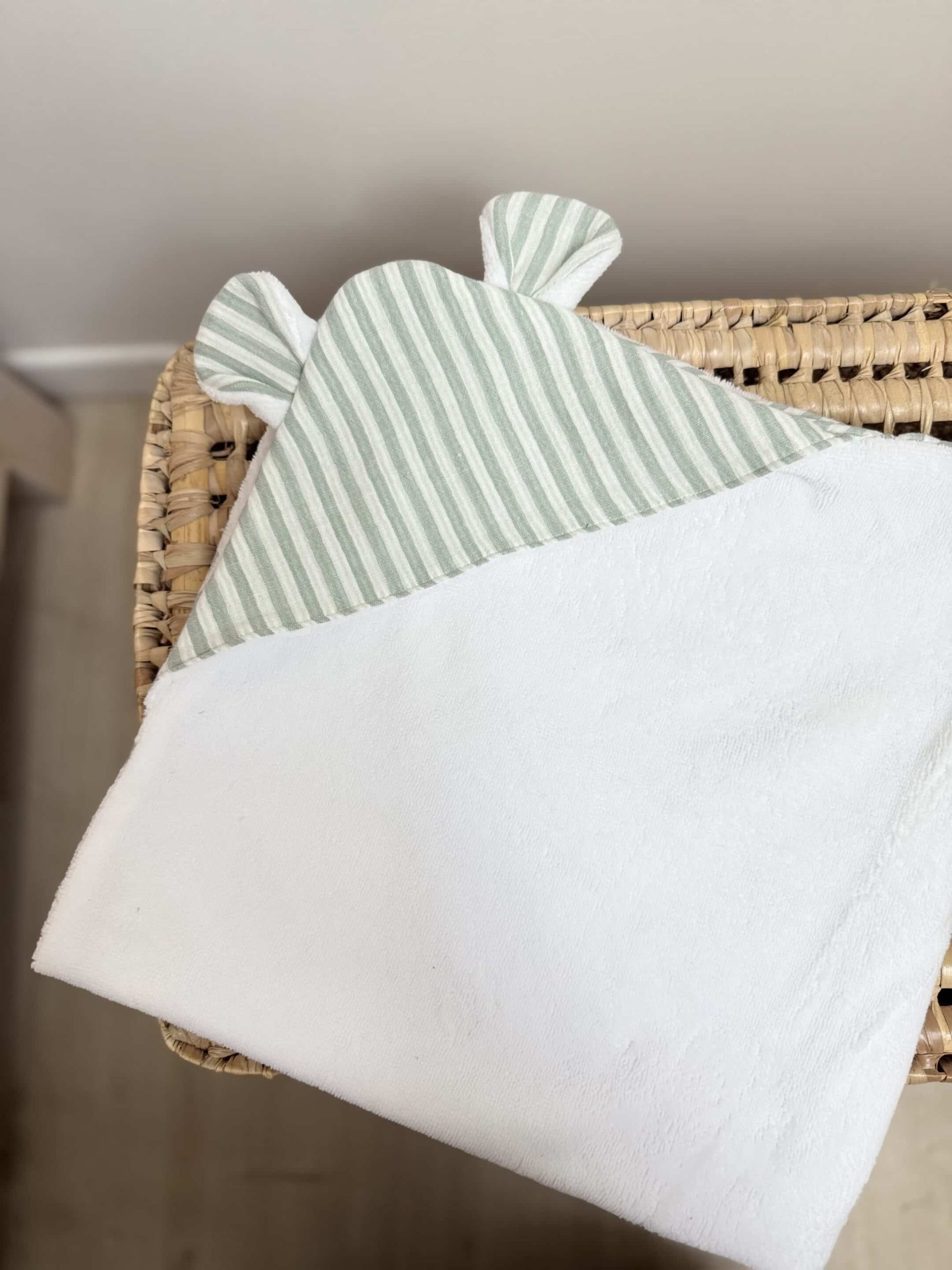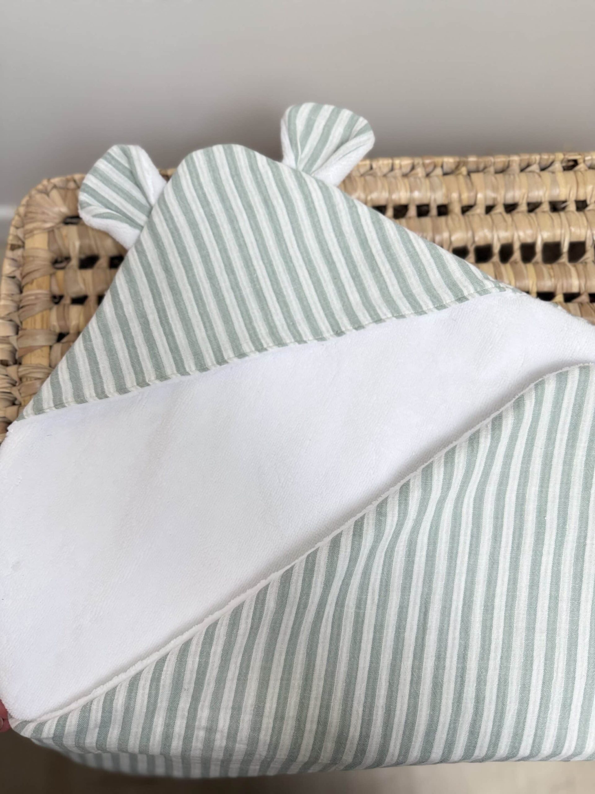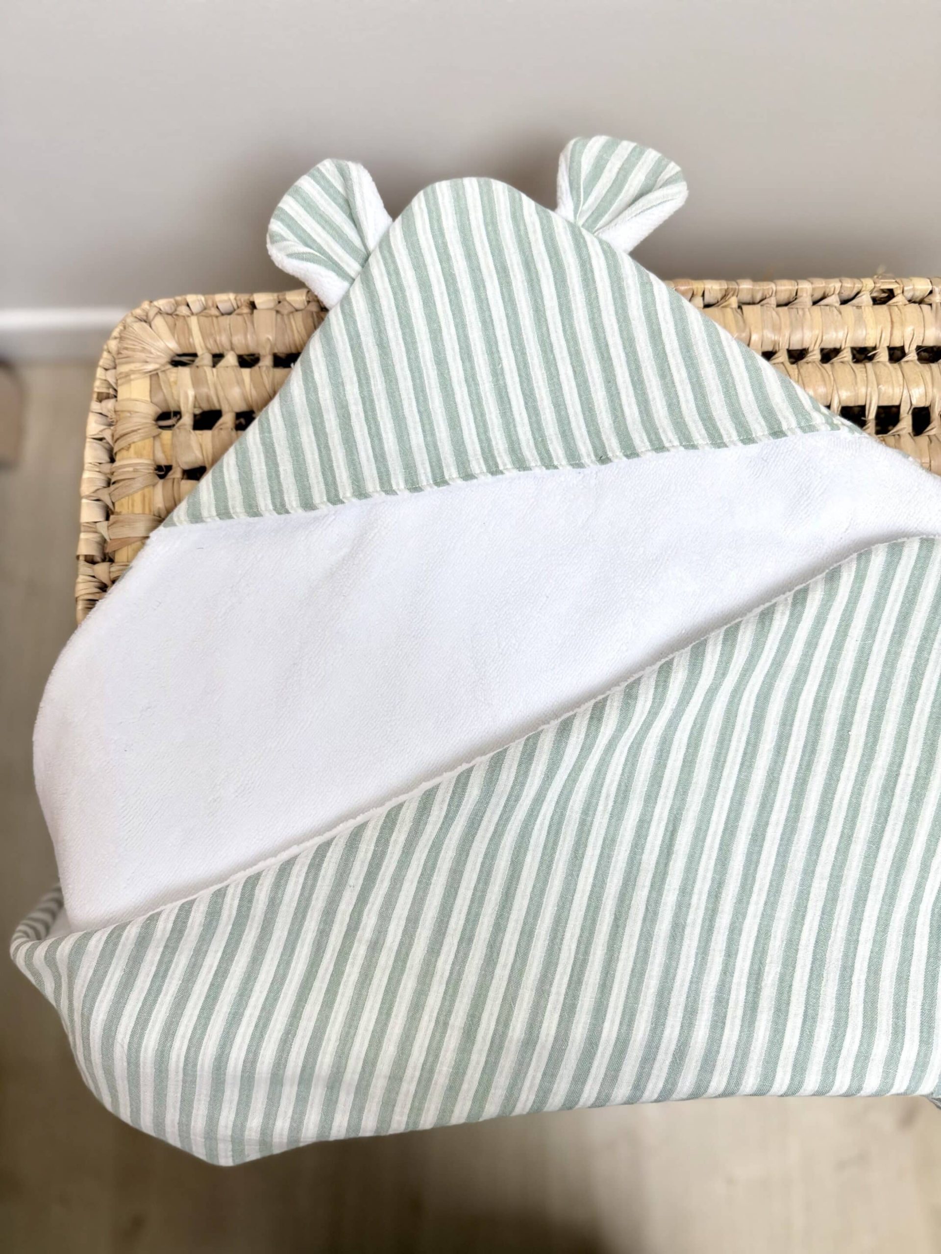 Cape de bain, double gaze rayée gaufrée vert de gris