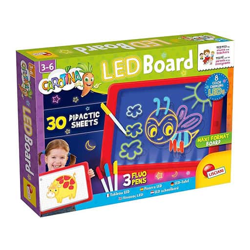 Carotina Tableau LED de la marque Italienne Lisciani. Jeu éducatif d’excellence. Age à partir de 3 ans et jusqu’à 6ans. Les jouets et les jeux éducatifs Lisciani sont une référence dans la matière! Les résultats sont garantis. Développer la capacité d’attention. Effets spéciaux pour dessins fluorescents. Amusez-vous à allumer des dessins, des lettres et des mots. Avec les feutres fluo fournis et les cartes à recaler, vous pouvez libérer votre imagination. Apprenez à lire et à écrire avec les cartes éducatives à difficulté progressive.