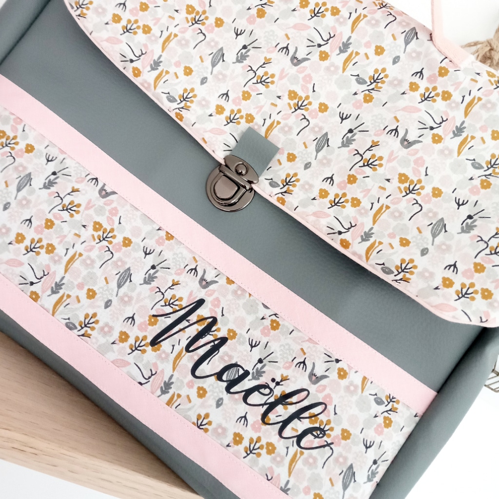 Cartable, fleuri rose et curry simili gris