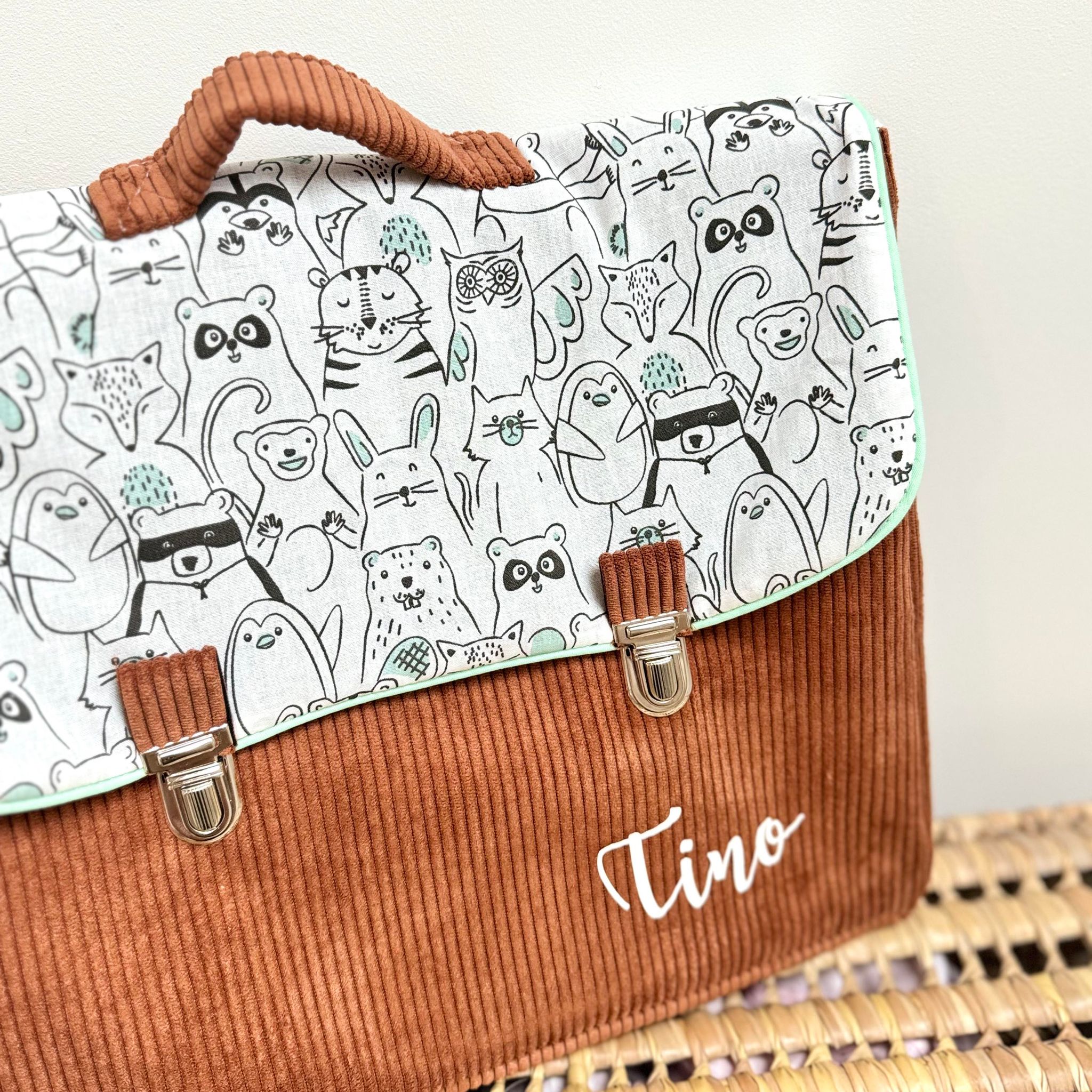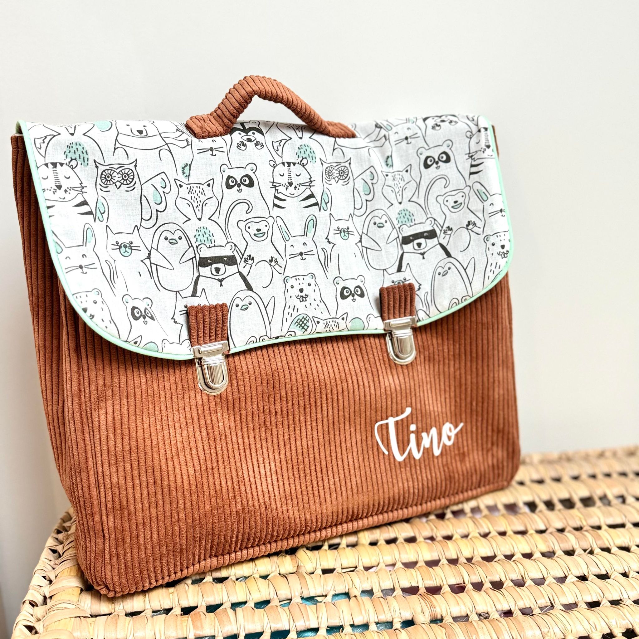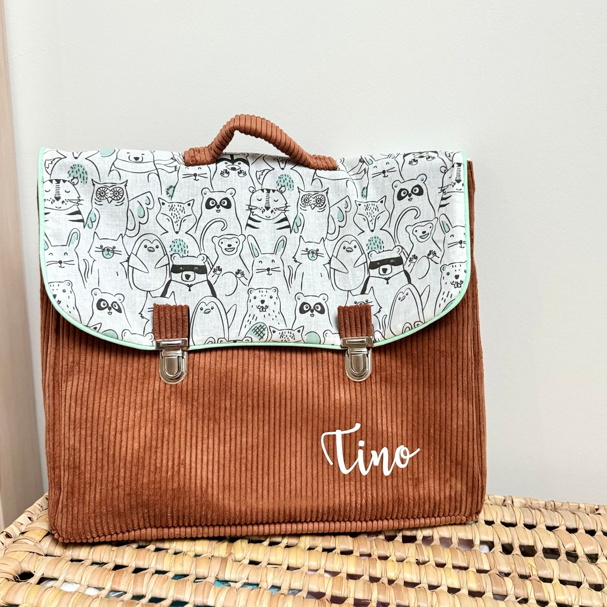 Cartable, velours côtelé écureuil et coton bande d’animaux