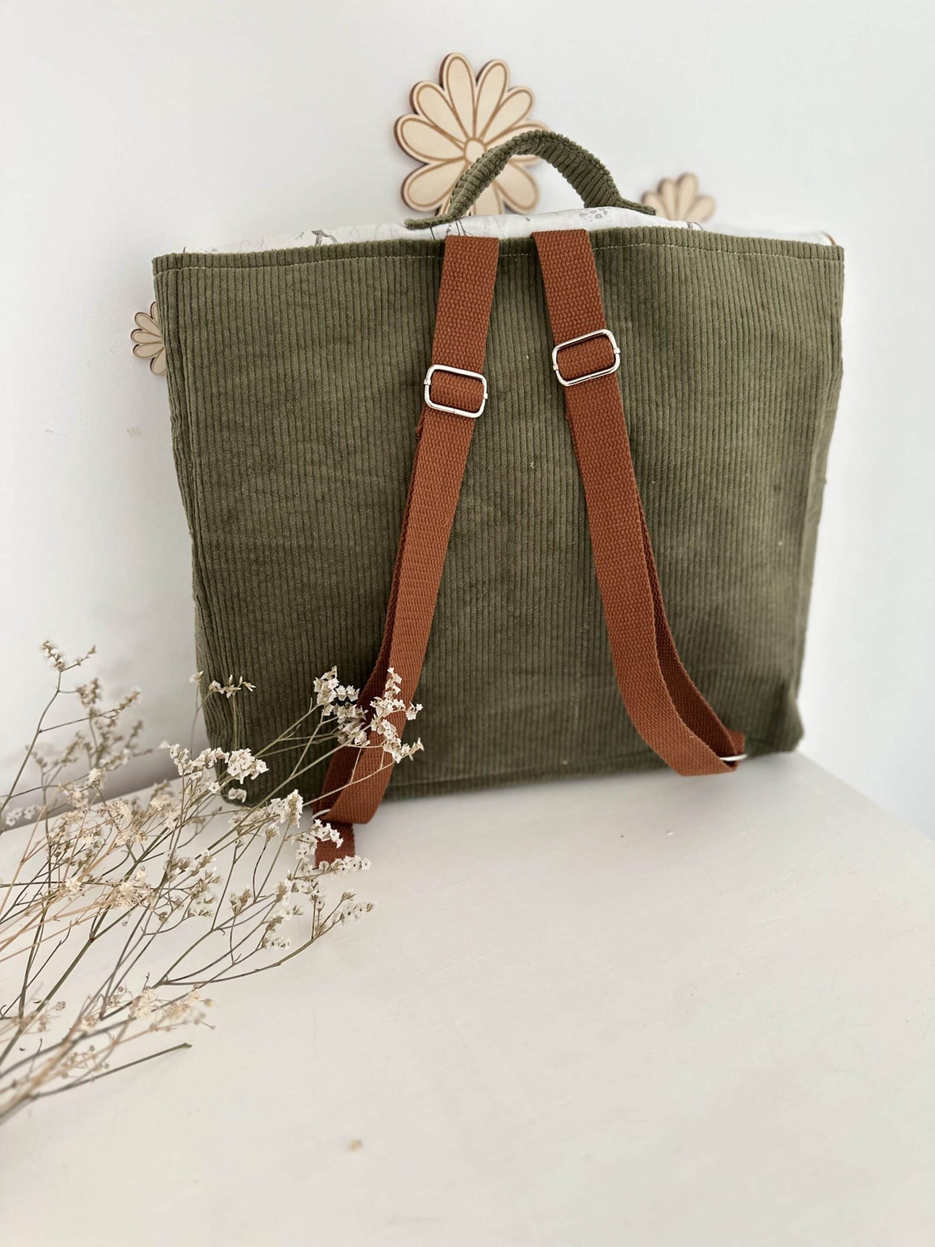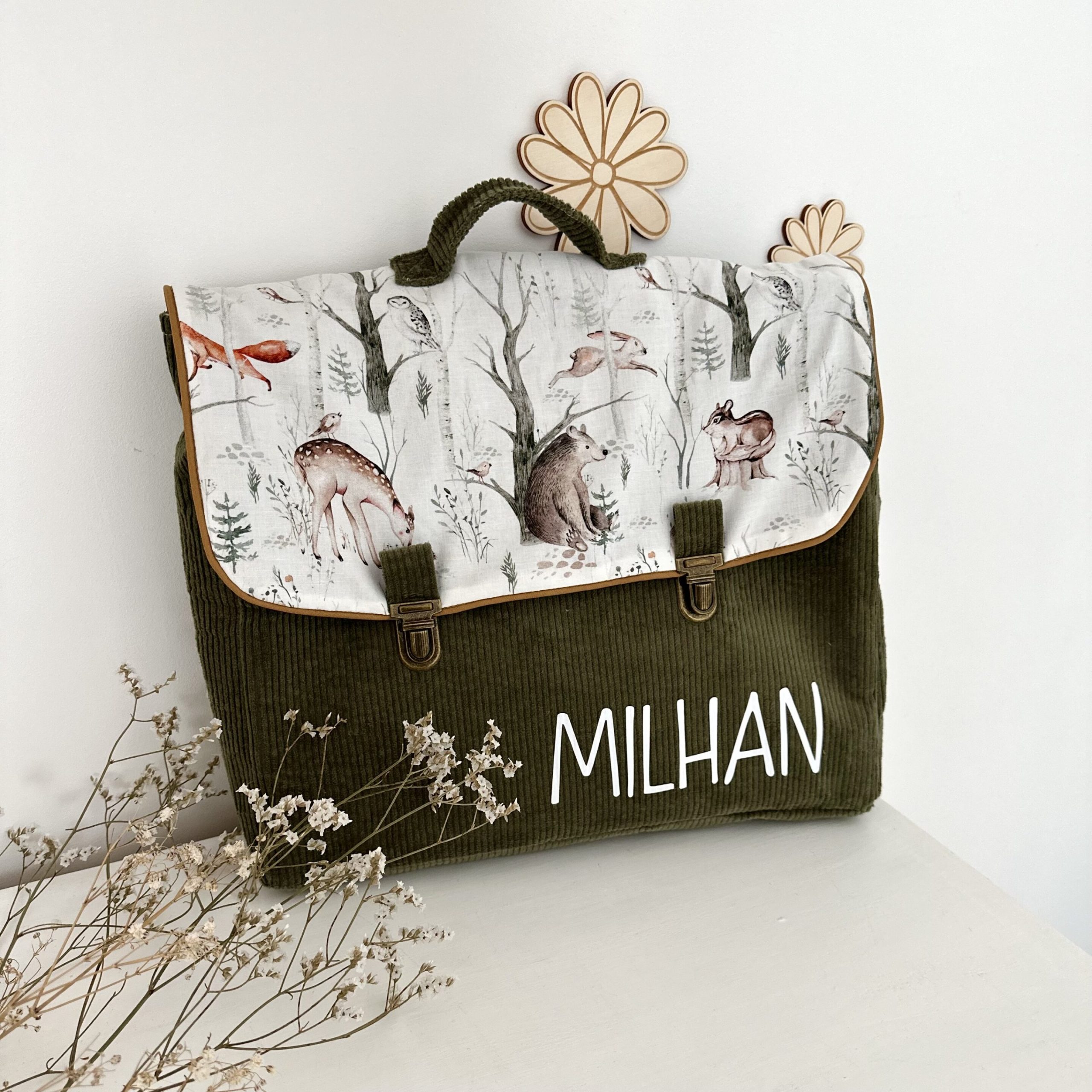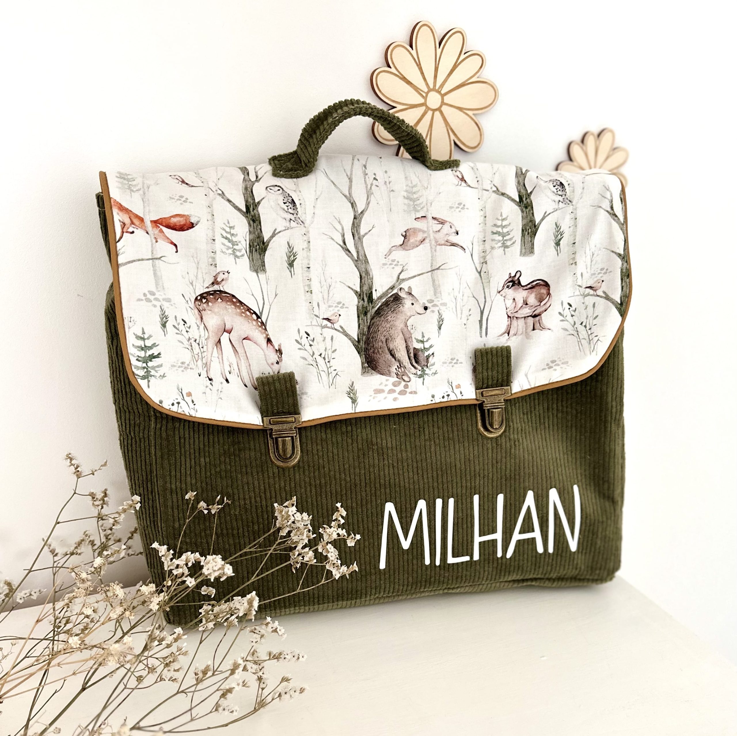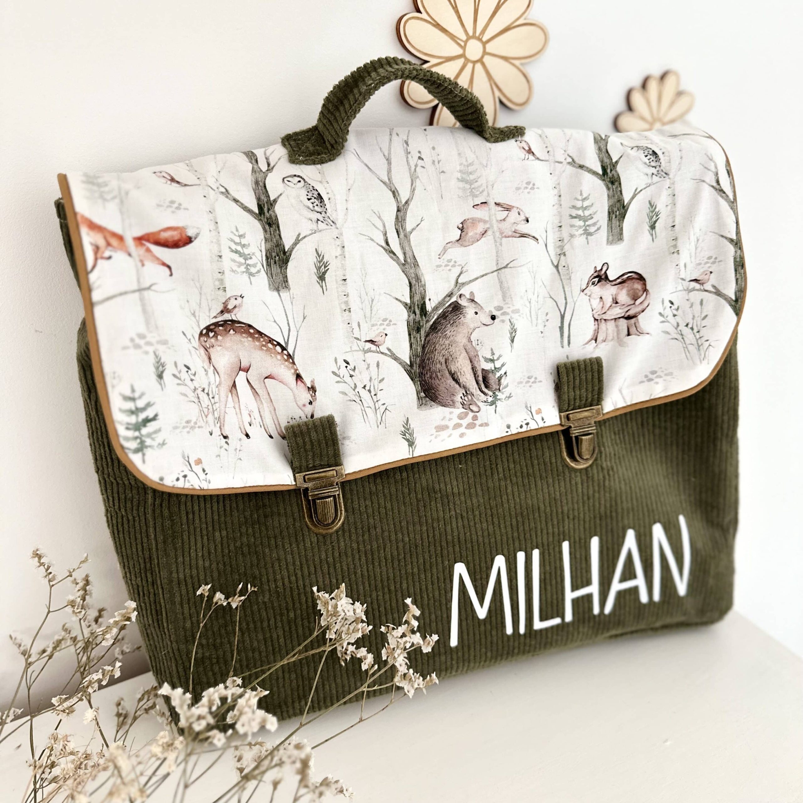 Cartable, velours côtelé kaki et coton forest