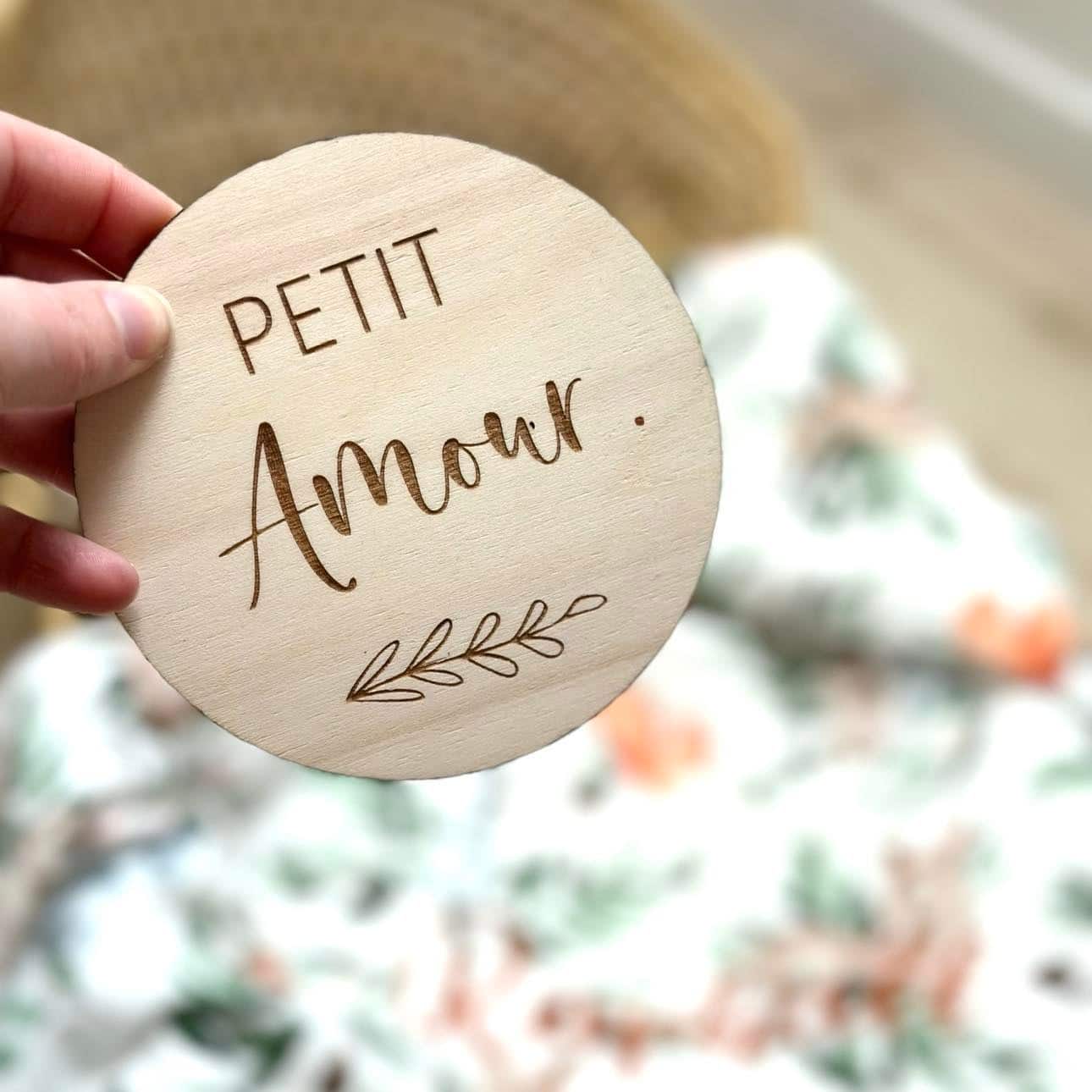 Une carte en bois gravé « Petit amour » sur le recto et personnalisable en vinyle sur le verso.