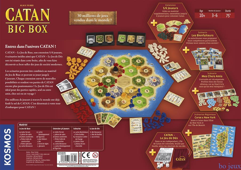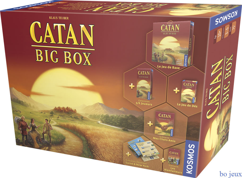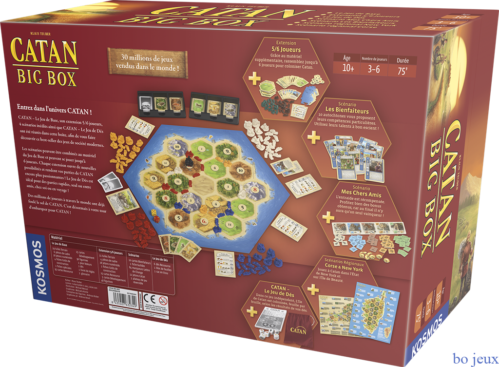 La Big Box Catan contient le classique du jeu de société, ainsi que des extensions qui permettent d’y jouer jusqu’à 6 joueurs ! Vous y trouverez également des scénarios qui modifient les règles de base et offrent de nouvelles possibilités (Mes chers amis et Les bienfaiteurs), mais aussi des mini-extensions à thème géographique… Catan à New-York, qui n’en a jamais rêvé ? Complète, inédite en français, cette Big Box fait le plaisir des fans de Catan, comme de ceux qui voudraient le découvrir ! Les scénarios contiennent 10 cartes Bienfaiteurs, 1 fiche de Guildes, 84 marqueurs Lettres de Change, 12…