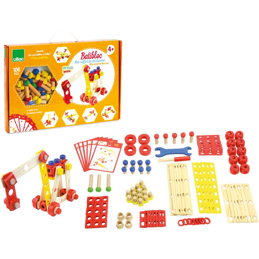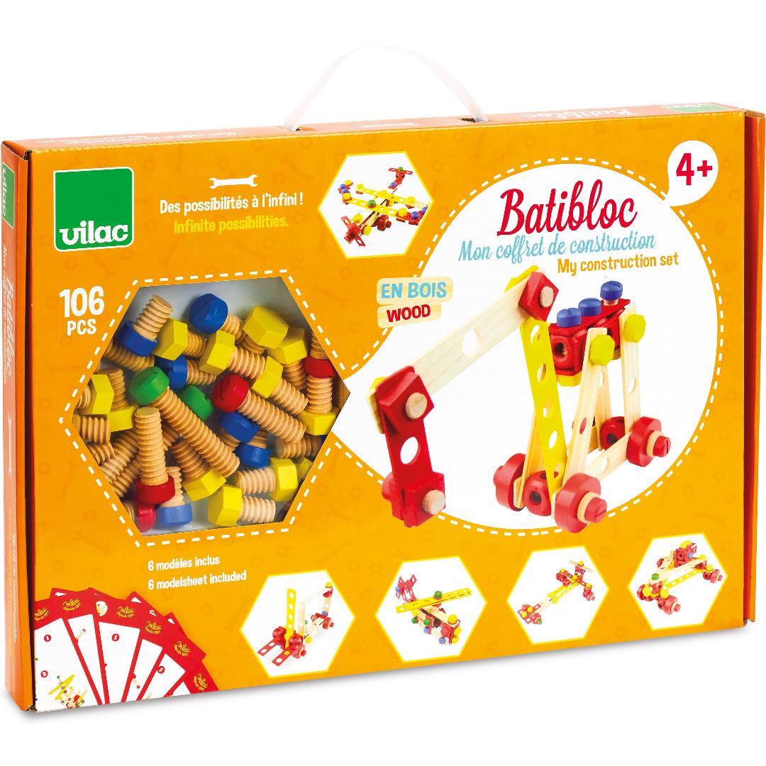 Un coffret de construction Batibloc, une valise comprenant 106 pièces pour créer de ses propres mains. Il va pouvoir, visser, devisser et assembler pour tout créer en s’aidant des fiches de modèles proposés ou en laissant libre court à son imagination. Un formidable jouet en bois de construction, pour une idée de cadeau ludique et créative ! Dimensions : 41,5 x 29 x 4 cm