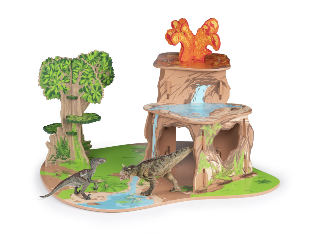 COFFRET LA TERRE DES DINOS en bois Velociraptor et Carnotaure offert – Papo