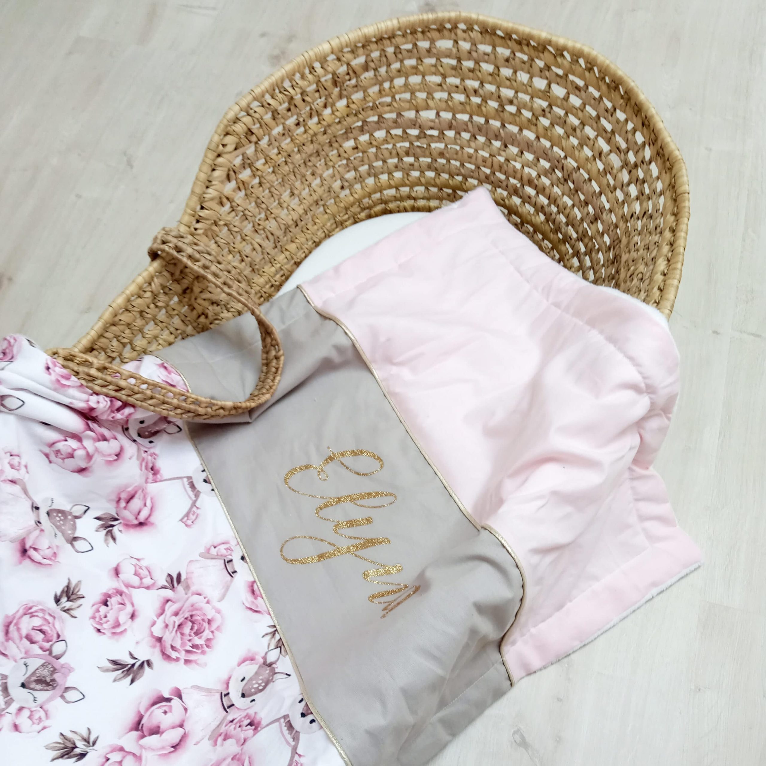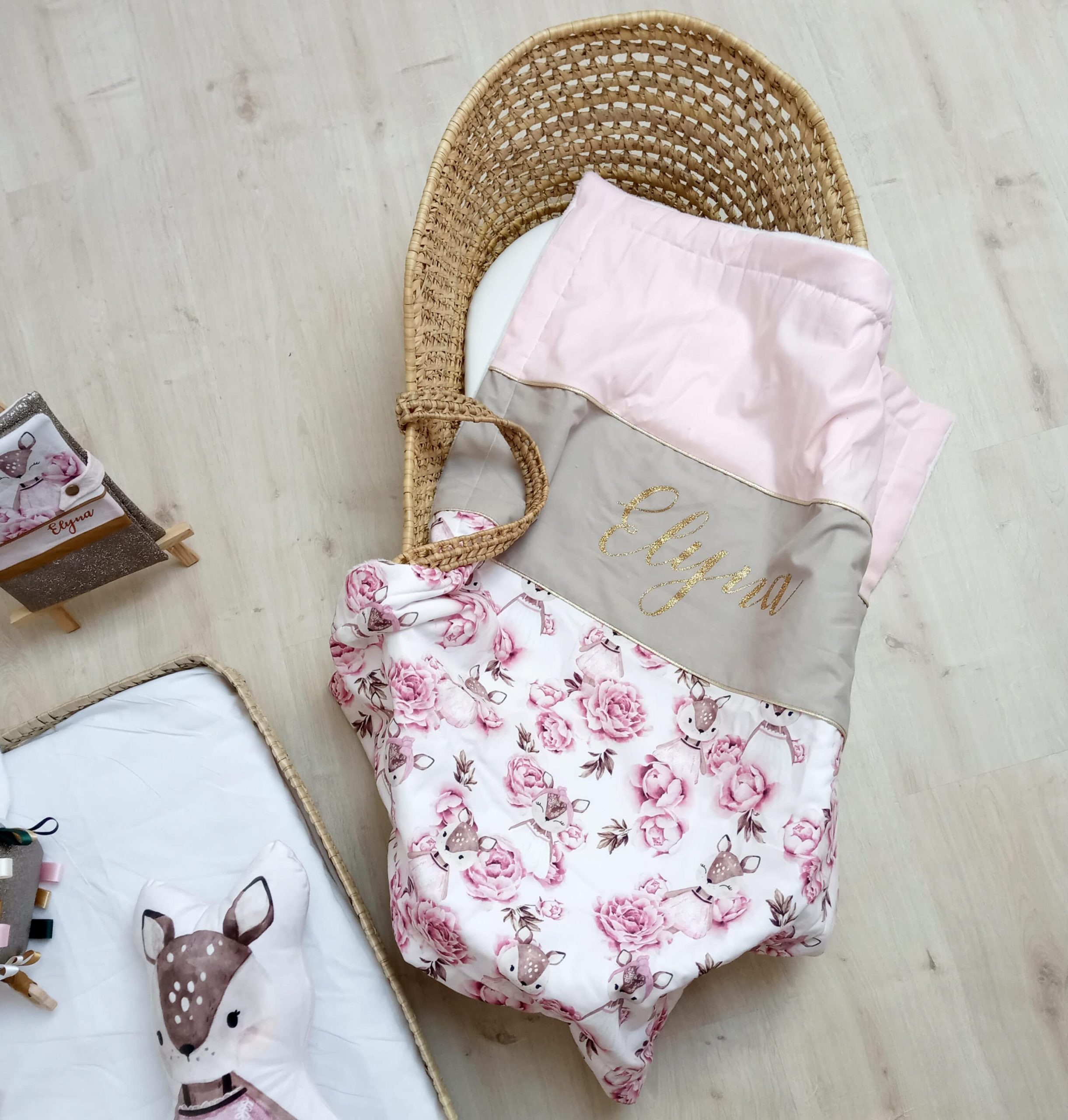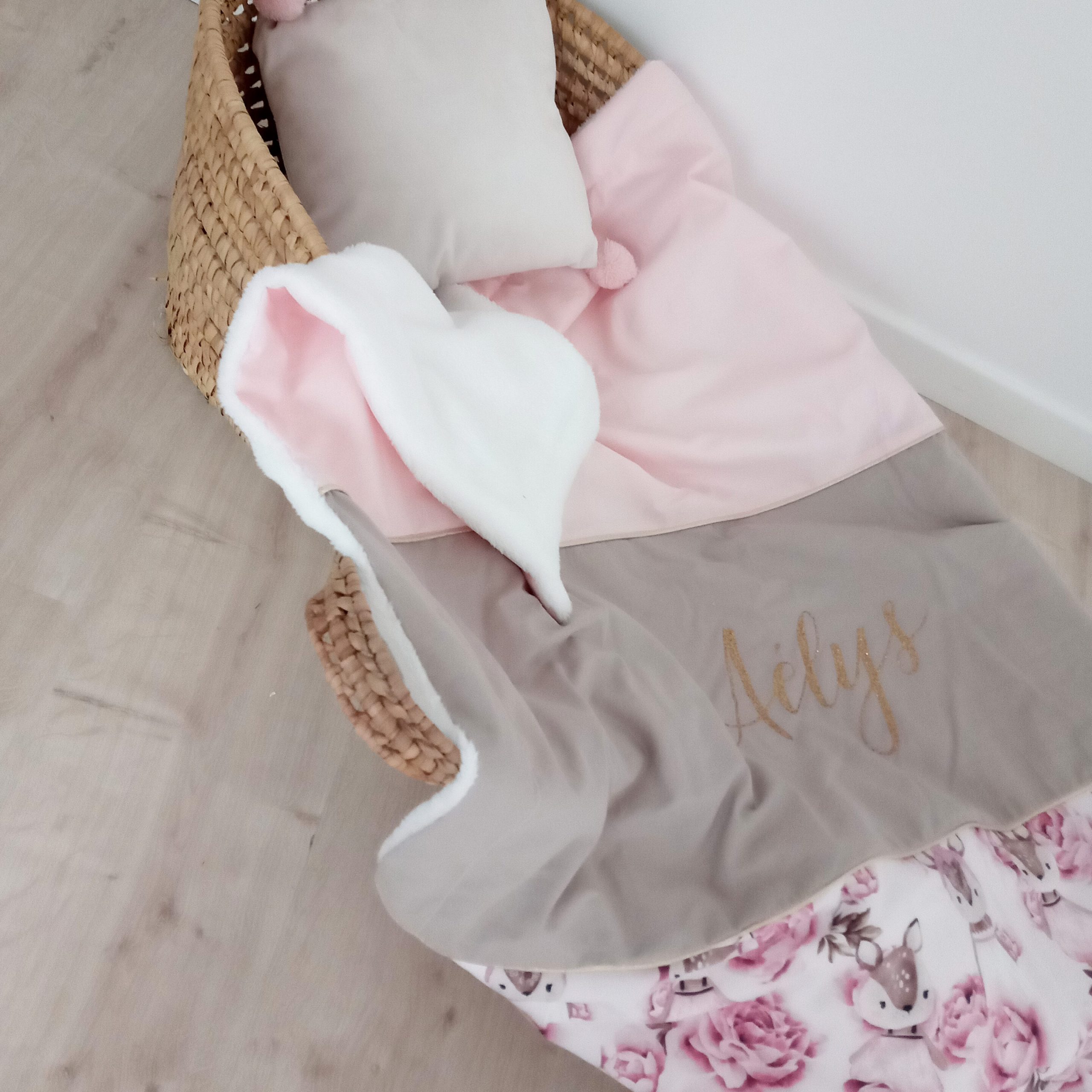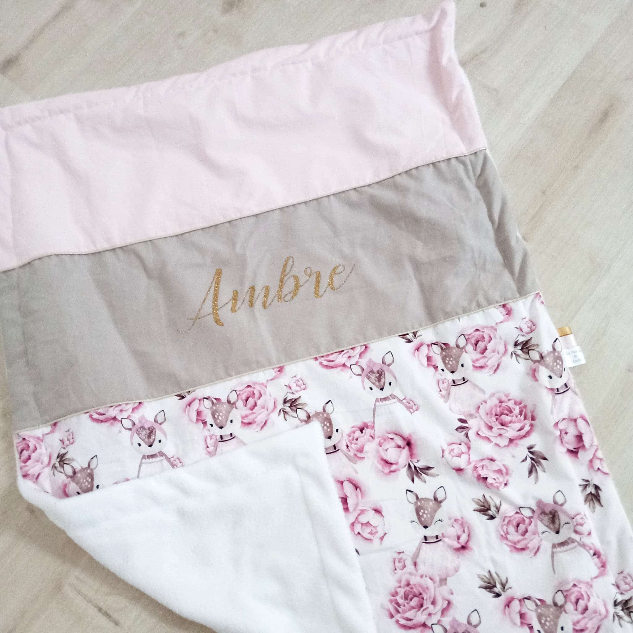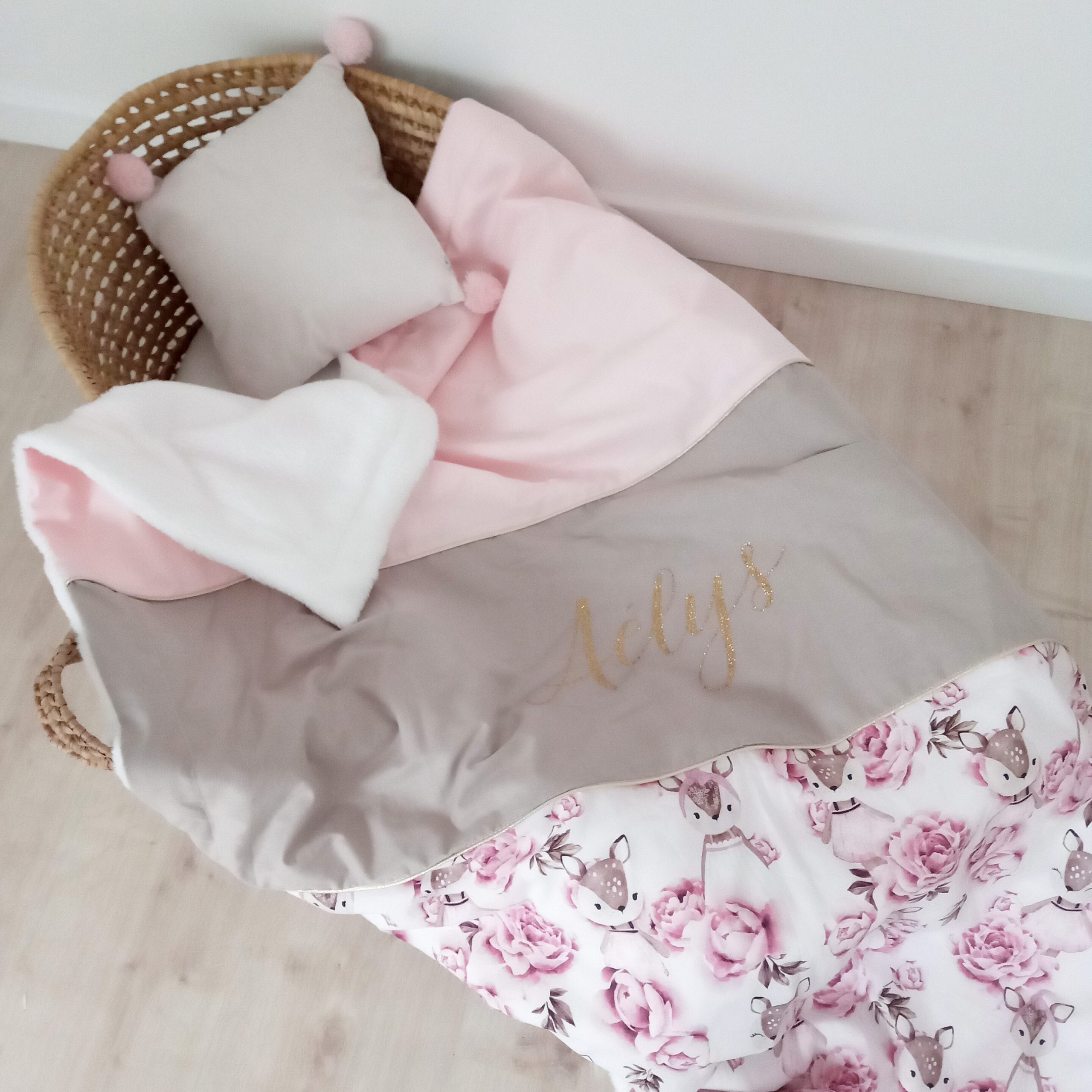 Couverture, faons et pivoines, rose pale et ficelle