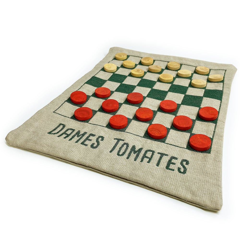 Les règles du jeu sont les mêmes que pour le jeu de dames classique. Pour jouer aux Dames Tomates, il faut être 2 joueurs. Pour démarrer la partie, commencez par installer le plateau de jeu (le sac de rangement, côté damier) au centre de la table, en pliant la partie haute du sac sous elle-même pour qu’il ne reste que le damier de visible. Le premier joueur choisit le set de pions rouges, l’autre joueur le set de pions jaunes. Tous les pions sont placés sur les cases de couleur du damier. Ces cases noires dans le jeu traditionnel, sont ici vertes dans le jeu Dames Tomates, car ce beau vert foncé rappelle la couleur des plants sur lesquels poussent les tomates. Chaque joueur place donc ses 12 pions sur les cases vertes des trois premières rangées de son côté (4 pions par ligne). Les pièces ne peuvent se déplacer qu’en diagonale et vers l’avant. Vous jouez l’un après l’autre. Chaque joueur déplace un de ses pions à tour de rôle et doit essayer de manger un ou plusieurs pions adverses en sautant au-dessus. Une prise est possible dès qu’un pion adverse est présent dans la case voisine en diagonale et qu’une case vide se situe derrière. Le joueur doit alors sauter par dessus le pion de l’adversaire pour le prendre. Dès qu’un pion atteint la dernière ligne du plateau, il se transforme en Dame et peut alors se déplacer plus librement et notamment reculer. Pour symboliser la dame, on ajoute un pion par-dessus celui qui a réussi à atteindre la dernière rangée. La partie s’arrête quand l’un des deux joueurs n’a plus de pions ou qu’il est bloqué et ne peut plus jouer aucun pion.