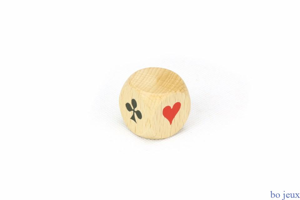 DÉ BELOTE – DÉ D’ATOUT EN BOIS : Dé en hêtre de 3 cm avec les symboles des cartes : cœur, trèfle, carreau, pique. A partir de 3 ans.