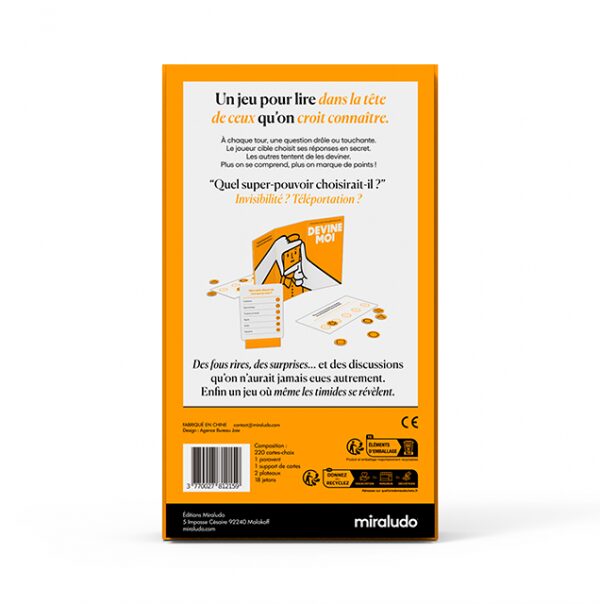 Un jeu pour lire dans la tête de ceux qu’on croit connaître. À chaque tour, une question drôle ou touchante. Le joueur cible choisit ses réponses en secret. Les autres tentent de les deviner. Plus on se comprend, plus on marque de points ! “Quel super-pouvoir choisirait-il ?” — Invisibilité ? Téléportation ? “Quel lieu lui ressemble le plus ?” — Une cabane dans les bois ? Un rooftop en ville ? Une île déserte ? Des fous rires, des surprises… et des discussions qu’on n’aurait jamais eues autrement. Enfin un jeu où même les timides se révèlent.