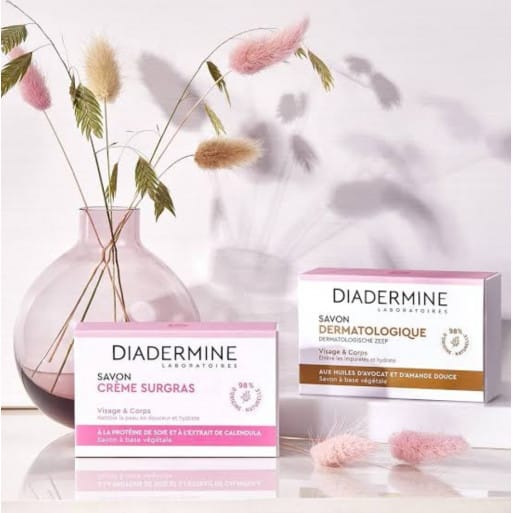 – صابونة دياديرمين الكريمية فائقة الترطيب للبشرة الجافة، مع بروتين الصويا وخلاصة الآذريون. ينظف البشرة بشكل مثالي دون تجفيفها ويرطبها، ويمكن استخدامه على الوجه والجسم
