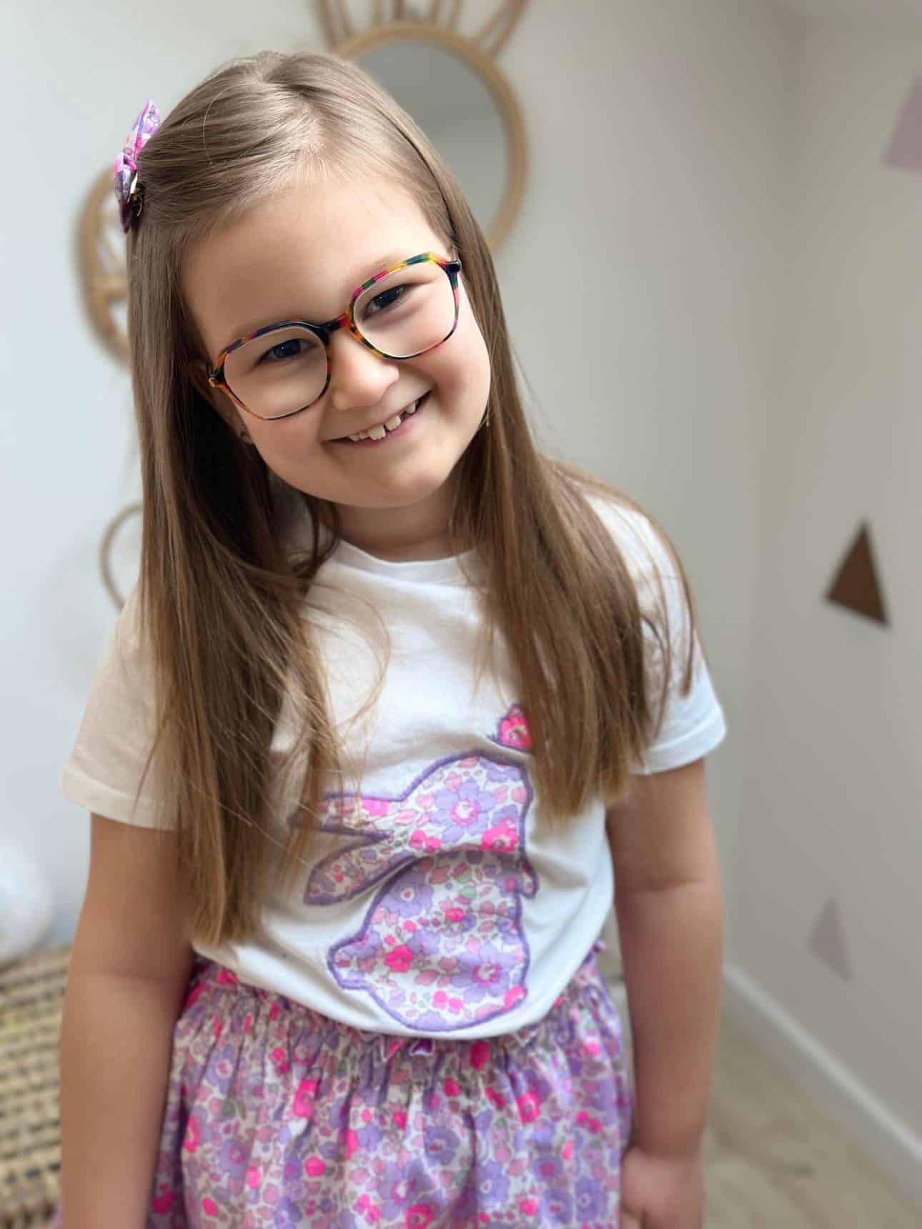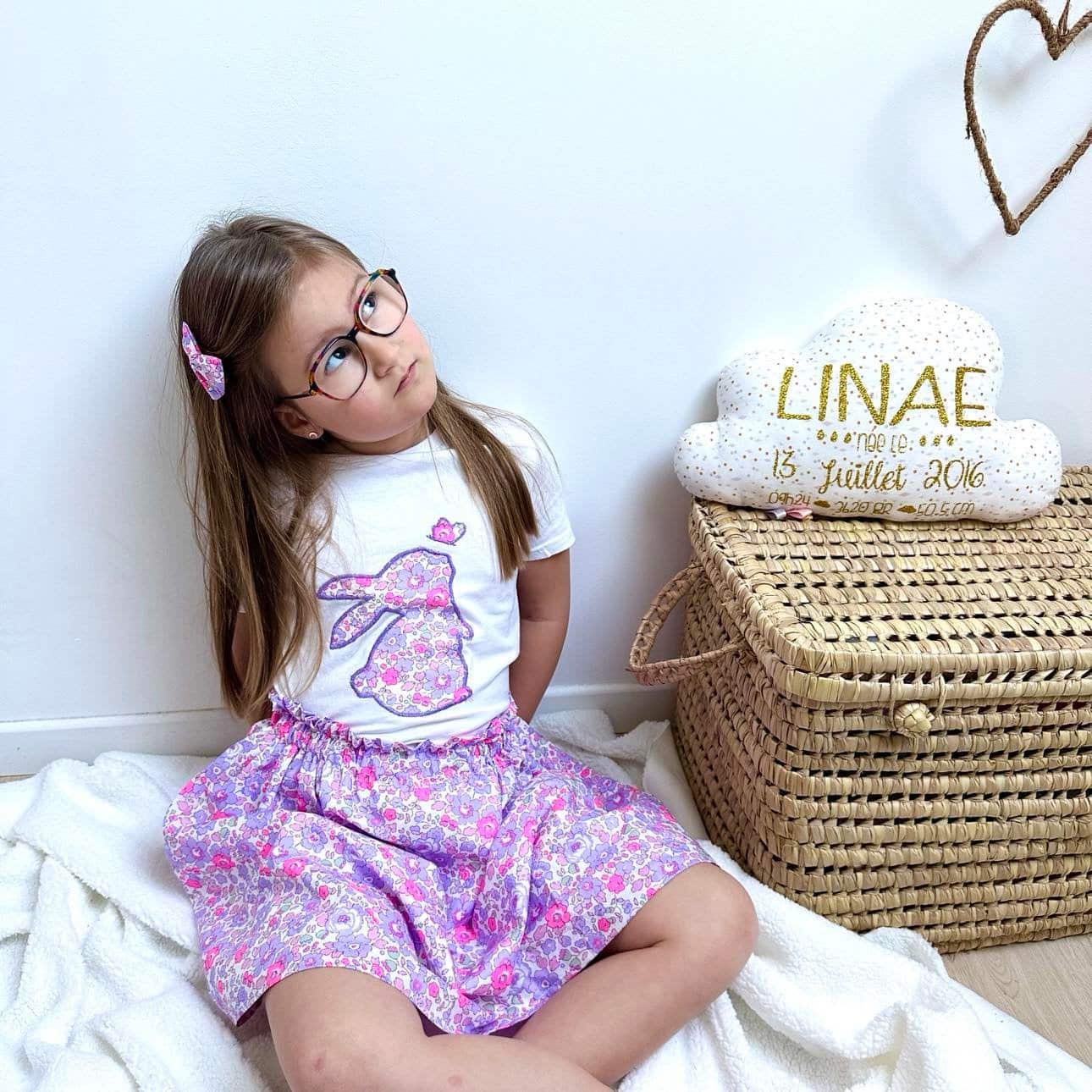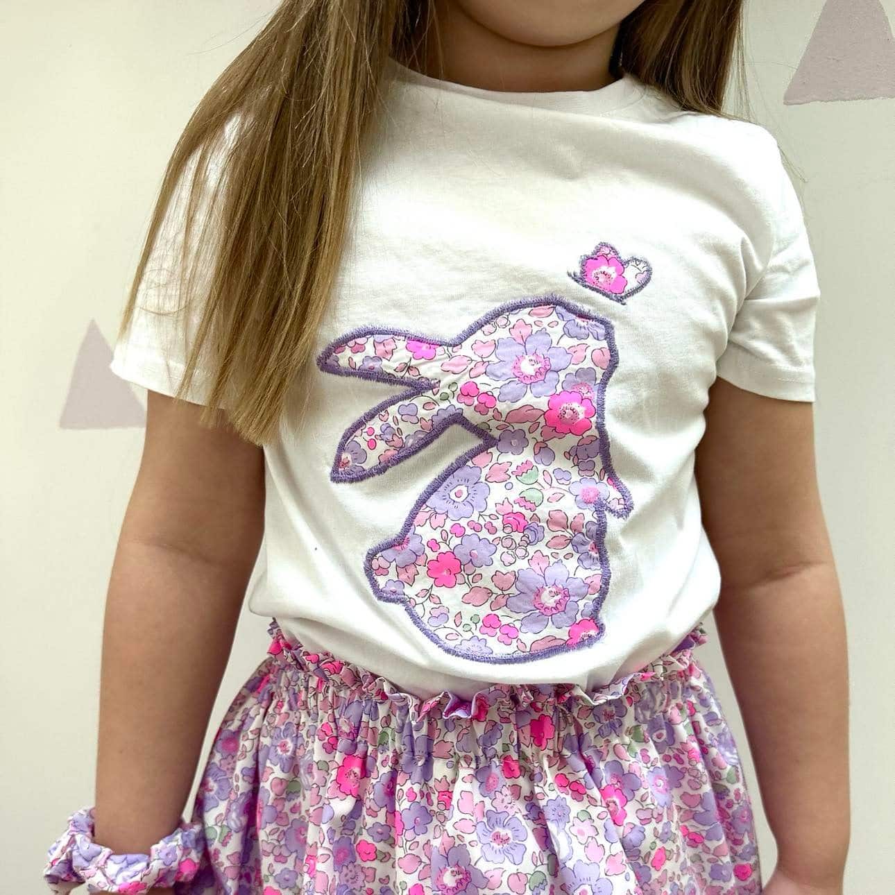 Le tee shirt 100% oeko tex kiabi sur lequel est appliqué le motif lapin et son petit papillon dans le même liberty que celui utilisé pour la jupette.