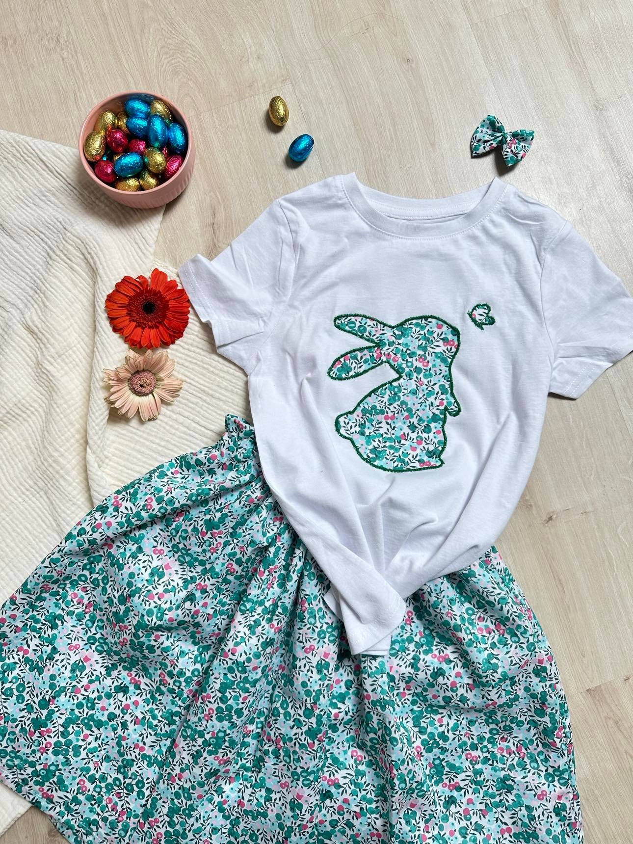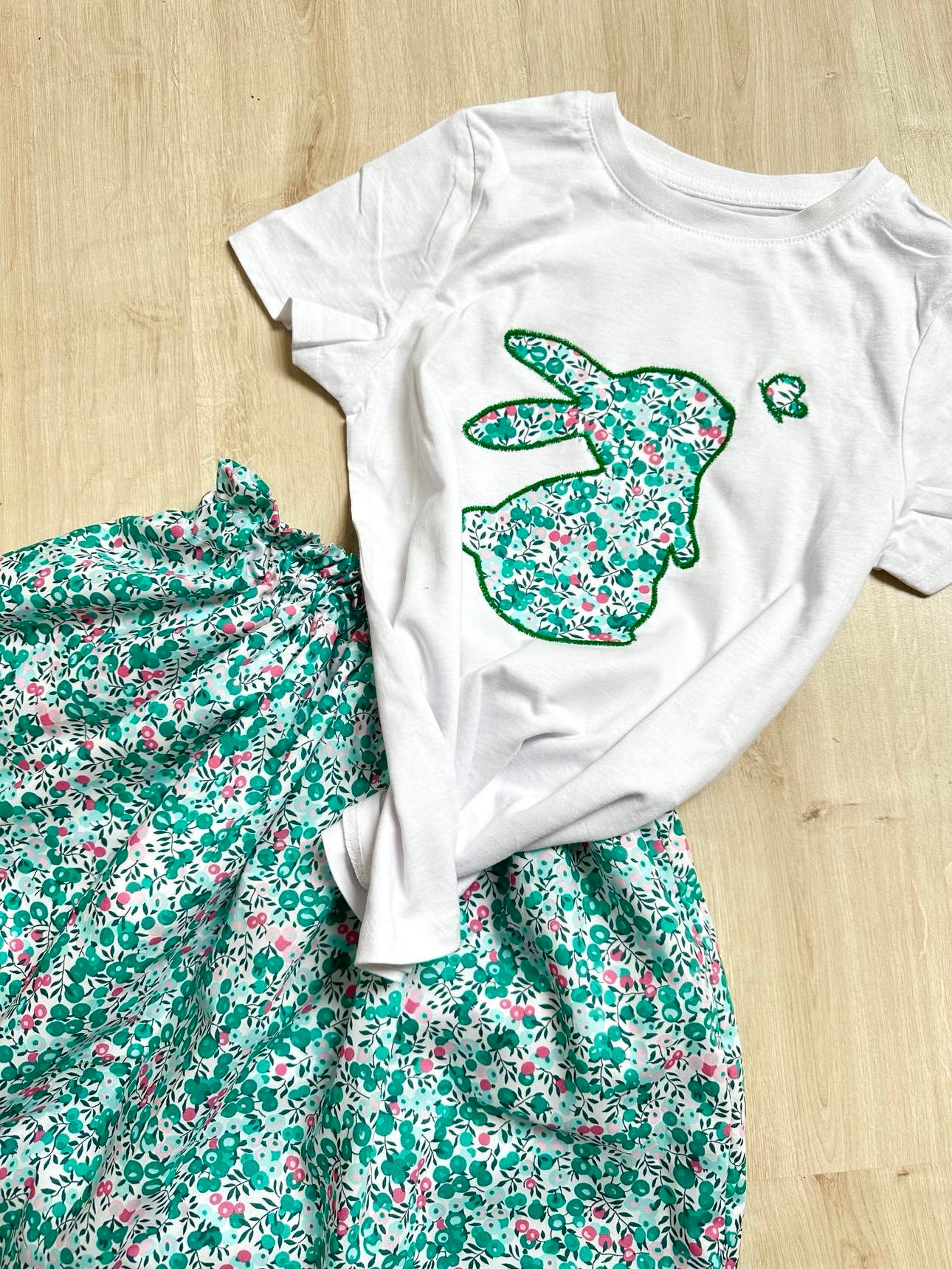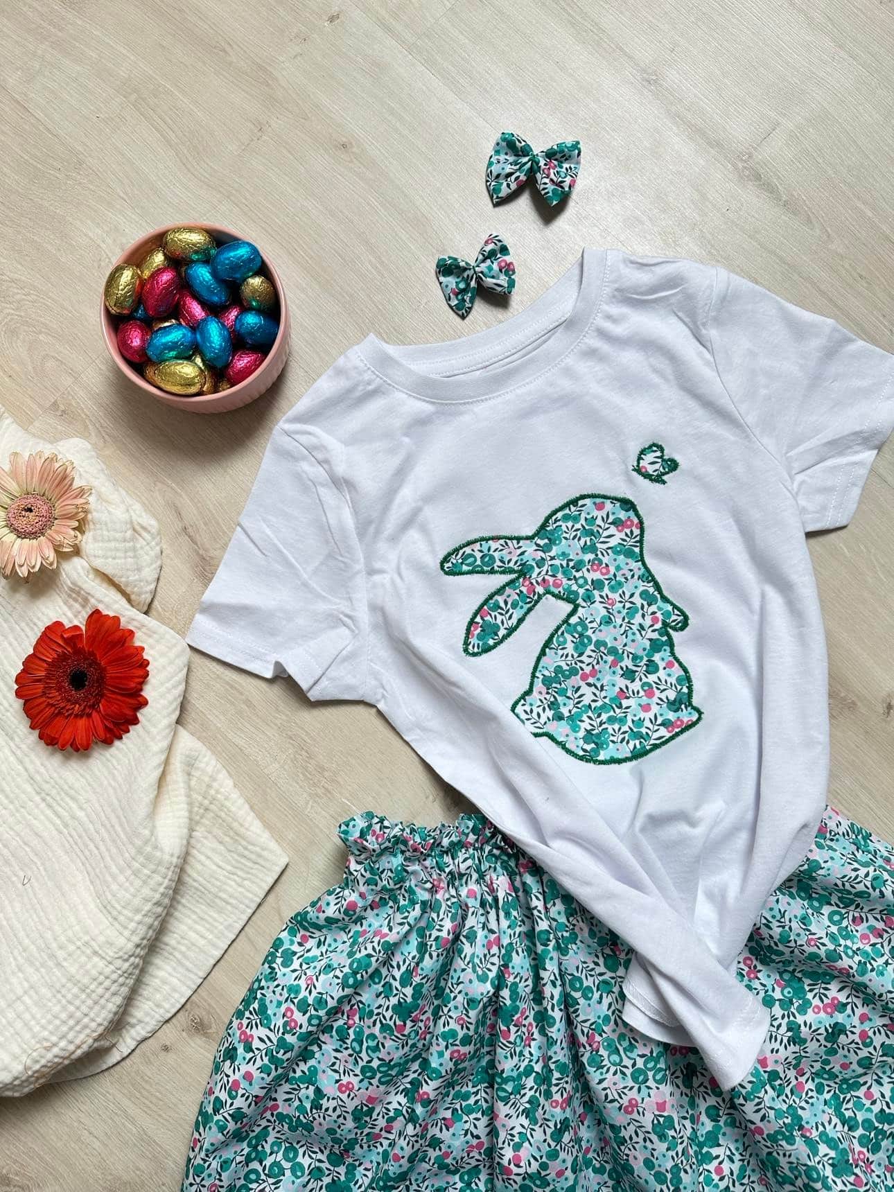 Ensemble Jupette et tee shirt lapin, Liberty wiltshire emeraude