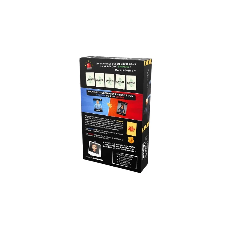“Uncover”, un jeu d’ambiance et de bluff qui vous plonge dans une enquête au cœur d’une banque. Deux équipes s’affrontent : les policiers qui tentent de déjouer un braquage et les voleurs qui essayent d’échapper à la vigilance des forces de l’ordre. “Uncover” est conçu pour 4 à 10 joueurs, à partir de 10 ans, avec une durée de partie d’environ 20 minutes. Les joueurs se répartissent en deux camps : policiers ou voleurs. Chaque joueur reçoit une carte d’identité en début de partie, indiquant son rôle secret. Les policiers ont pour mission de découvrir quelle banque est attaquée et…