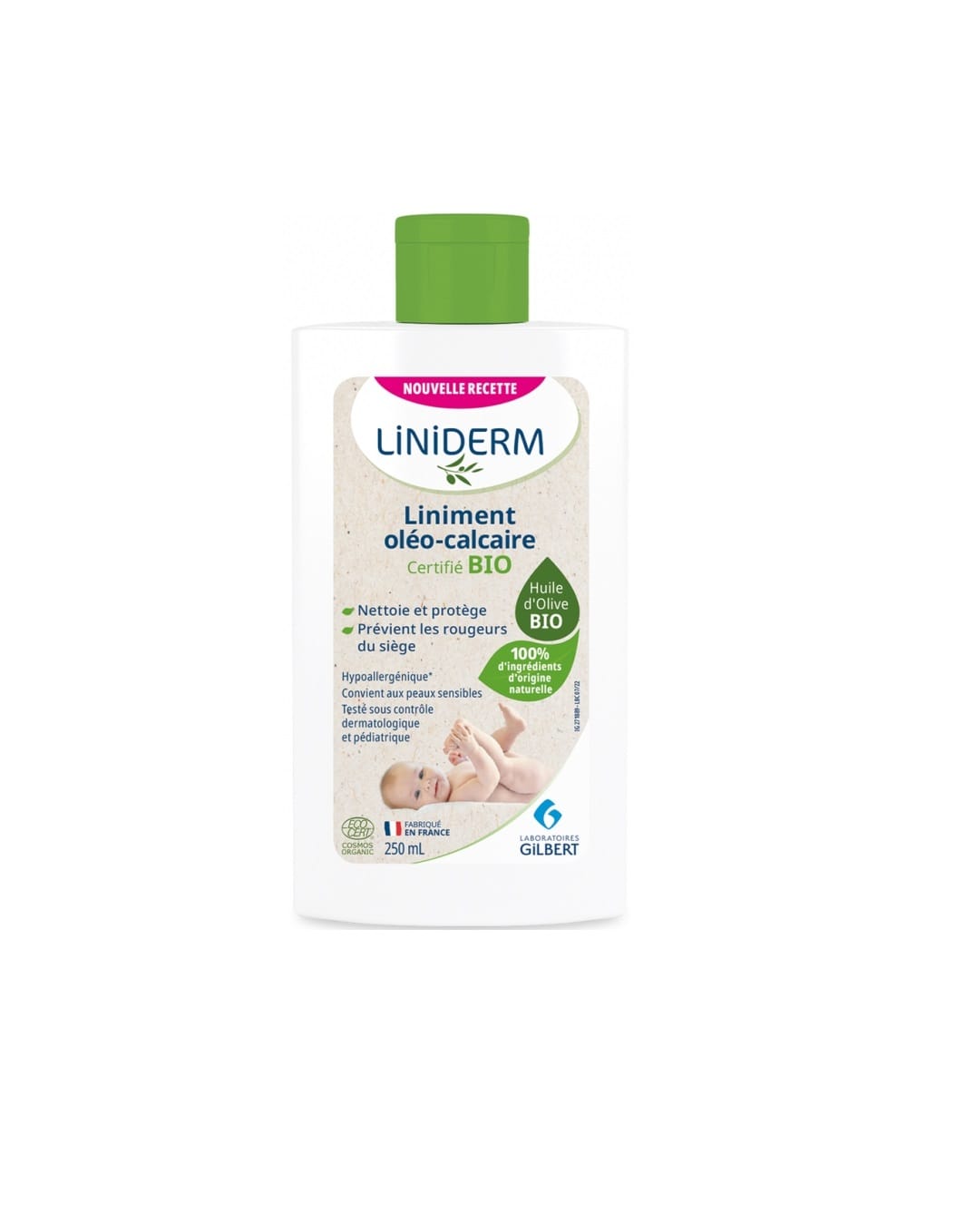 Gilbert Liniment Liniderm Oléo-Calcaire 250ml a une Formule traditionnelle 99,8 % naturelle : base d’huile d’olive et d’eau de chaux, avec des stabilisants d’origine naturelle, sans conservateurs, silicone, colorant, parabène, parfum ou huile minérale Flacon pompe pratique de 480 mL, facile à doser en une seule pression, avec une texture fluide adaptée à la toilette du change