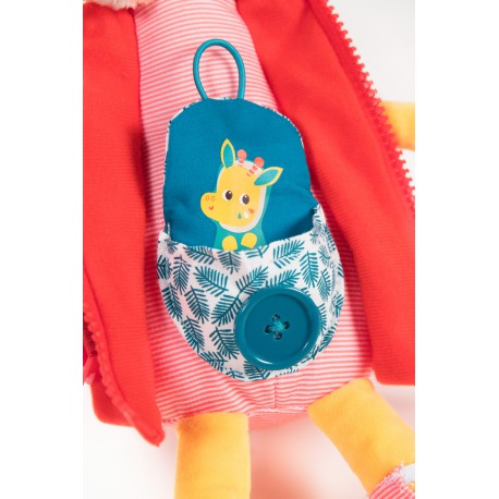 Girafe à habiller La girafe Zia adore les vêtements. Ouvrez et fermez la tirette de sa veste, exercez-vous à cliquer sa ceinture et nouez les petits rubans de ses chaussettes. Son bébé se cache dans la pochette à bouton sur son ventre. Stimule la motricité fine et exerce les habiletés d’habillage et de déshabillage.