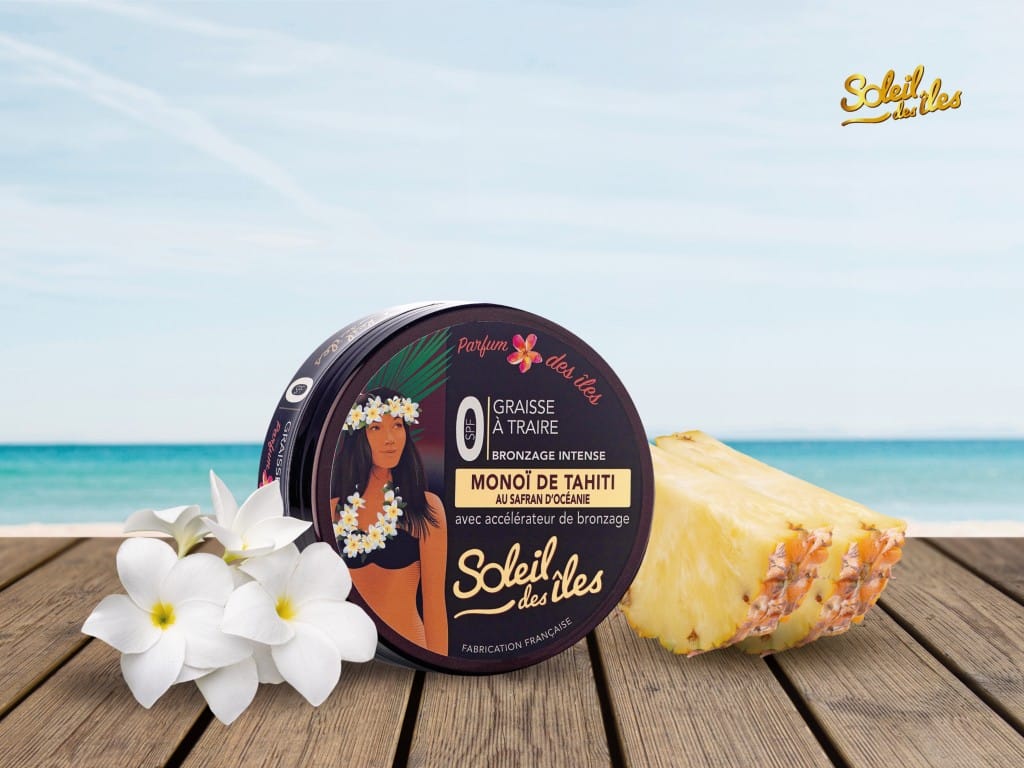 La graisse à traire Soleil des Iles est un produit solaire enrichi en monoï de Tahiti. Sa formule unique nourrit votre peau intensément. Son parfum envoûtant vous transporte instantanément sous les tropiques, pour une sensation de vacances à chaque application.