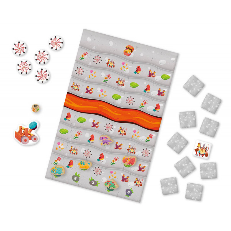 Retournez les tuiles pour retrouver les bons symboles et être le premier à atteindre le trésor ! Mais attention, le parcours est semé d’embûches… Vos adversaires peuvent créer une coulée de lave pour vous empêcher d’avancer, ou le dé peut tomber sur le tremblement de terre et chambouler tout. Heureusement, la tuile catapulte pourra vous aider, et vous revoilà dans la course !