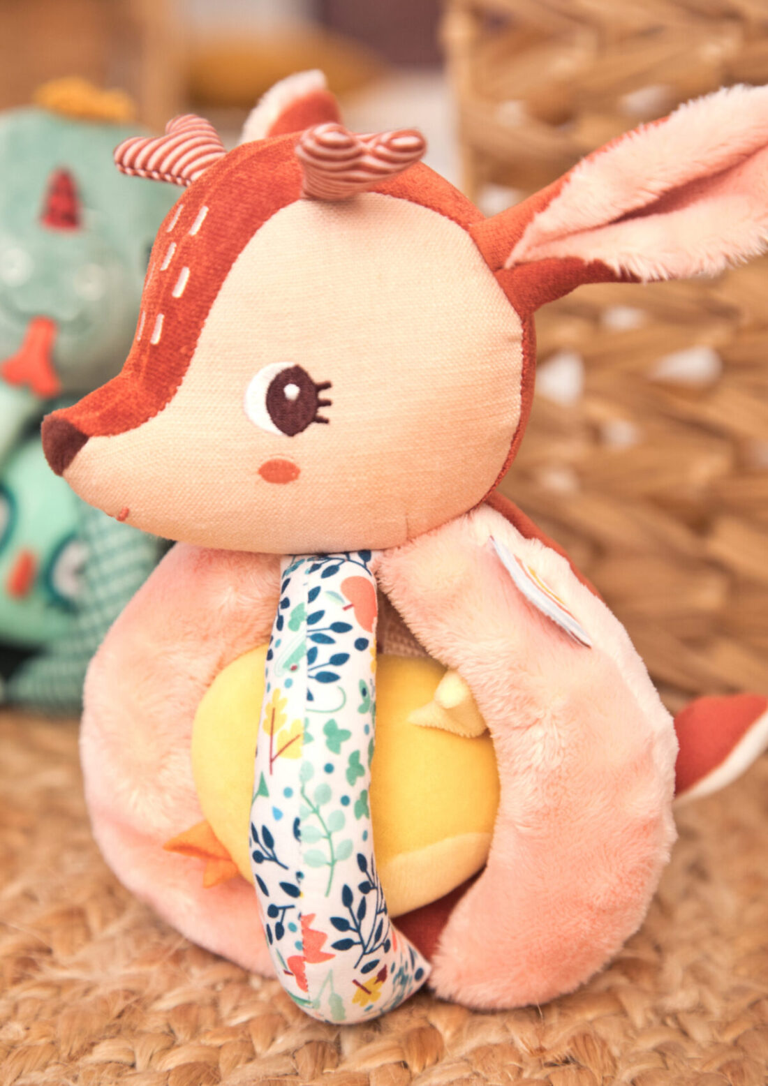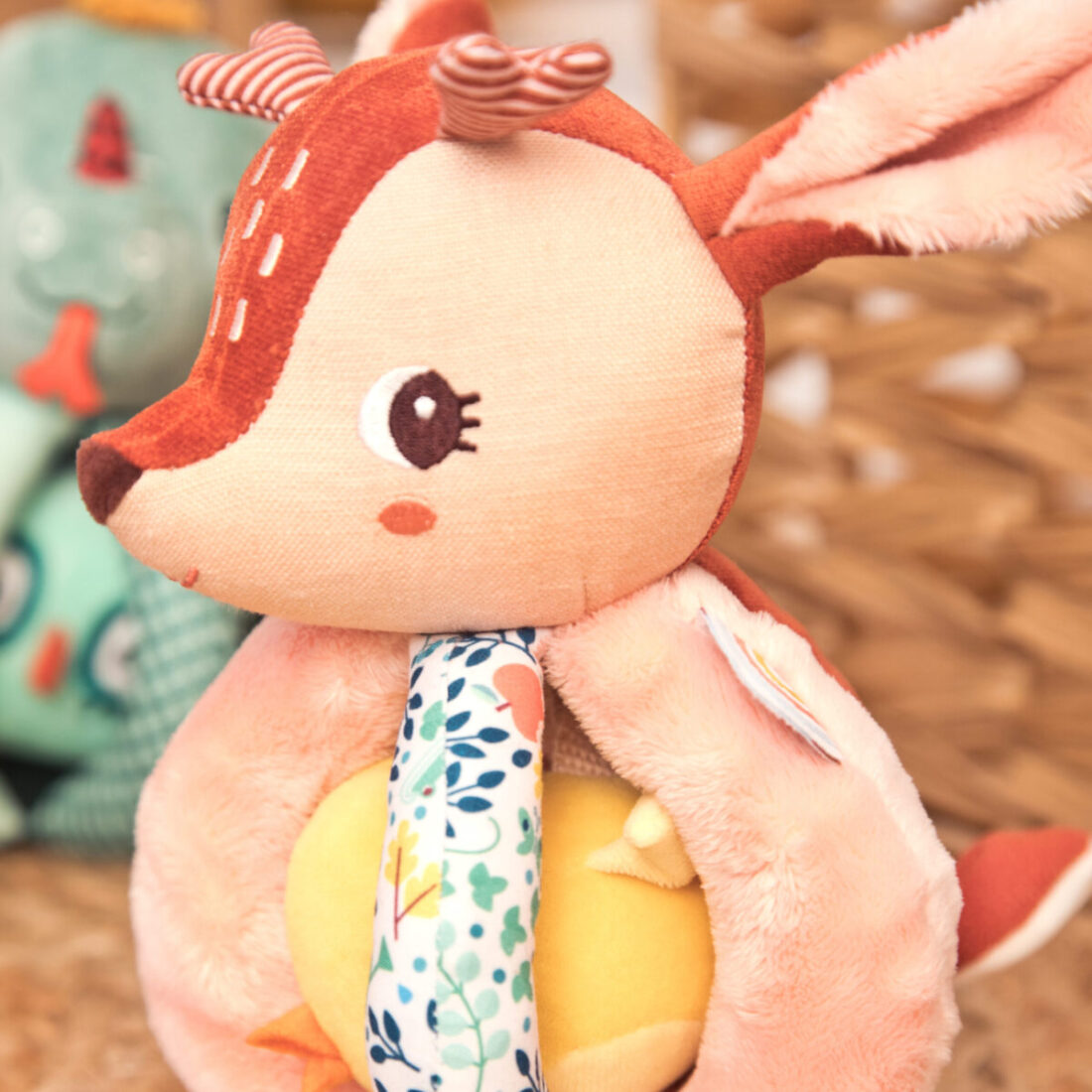 Un hochet original, que les petites mains saisissent facilement. Un petit ami se cache entre les poignées. Composition externe : 100% polyester / Interne : 100% polyester recyclé – Certification GRS Instruction de lavage Lavable en machine à 30° C – cycle délicat