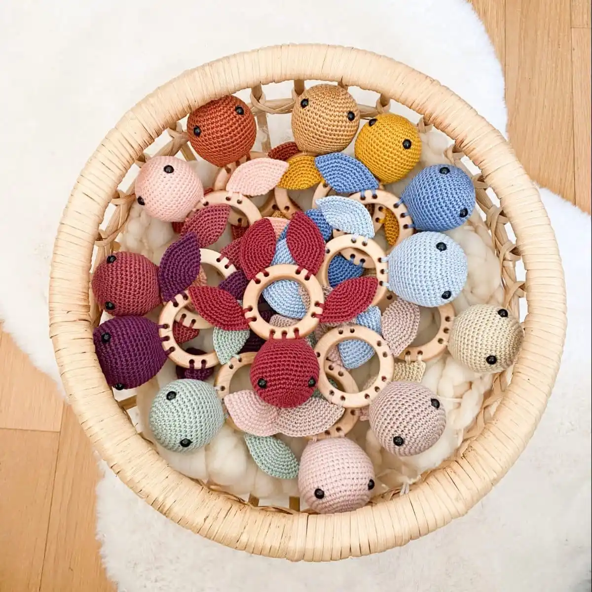 Le petit plus de ce hochet ? Disponible dans un large éventails de couleurs : Moutarde, Gris, Rose, Bleu, Beige, Blanc, Cuivre, Mint, Bleu roi, Rose poudré, Framboise, Caramel, Café Crème, Beige Mongo, Saumon, Cerise, Prune. Il y en a forcément un qui va vous plaire.