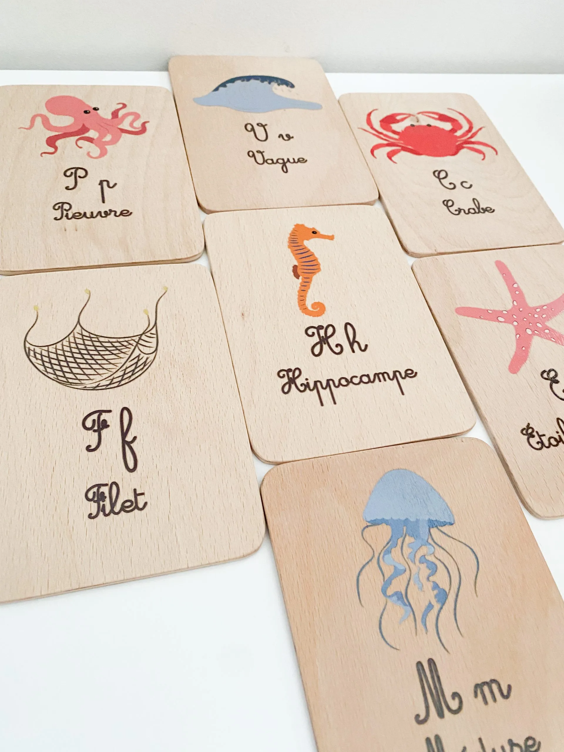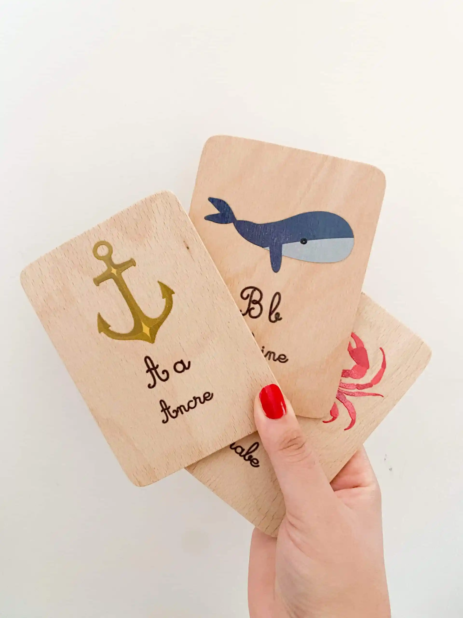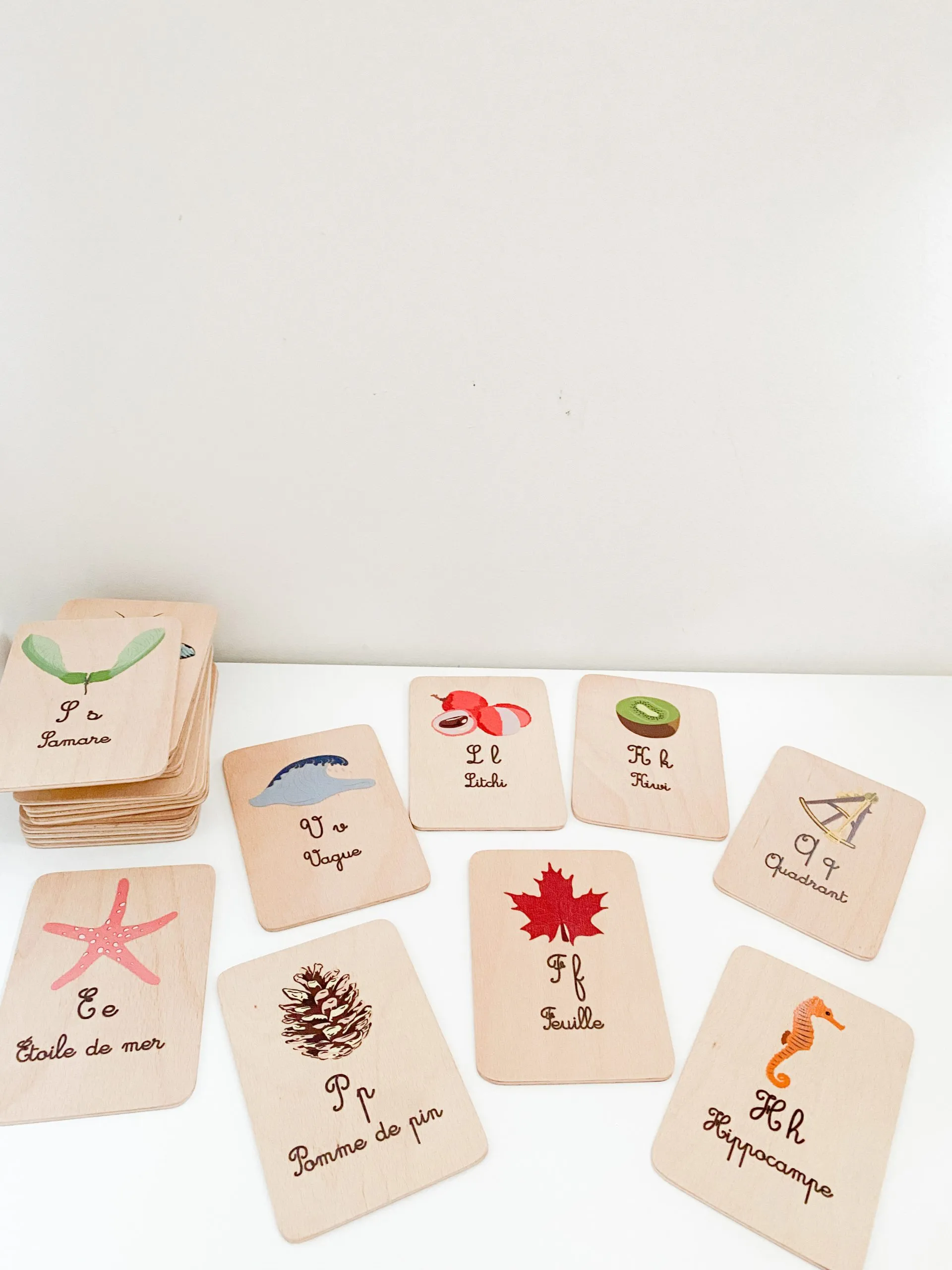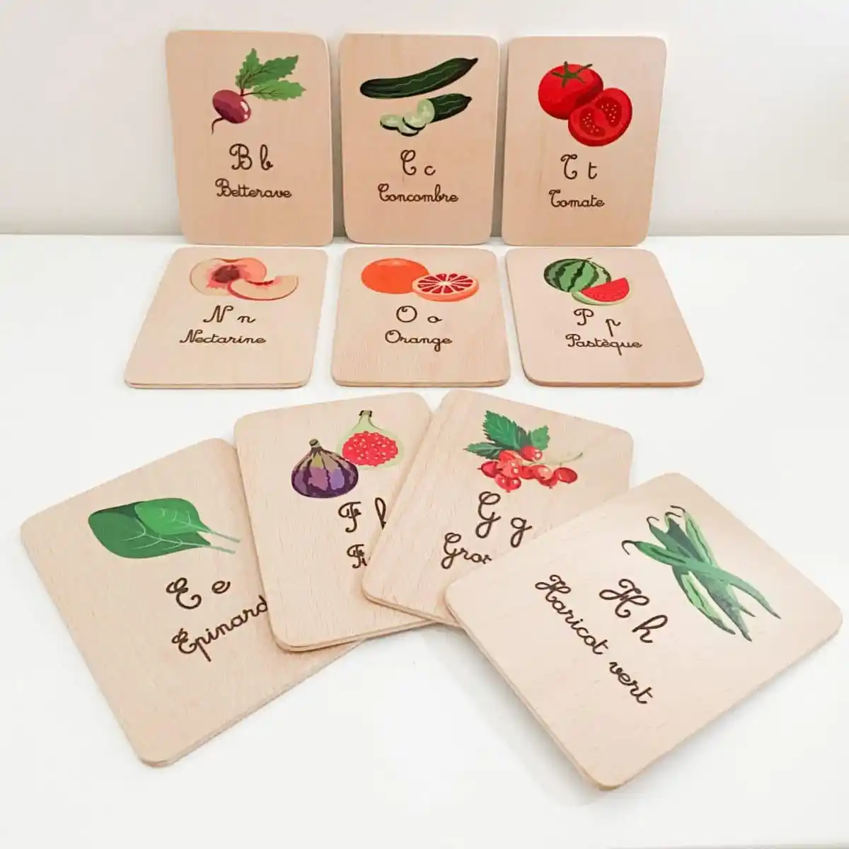 Ce jeu se compose de 13 cartes recto/verso. Des cartes en bois illustrées avec de jolis dessins sur le thème de l’alphabet de la nature, des mots et des couleurs.