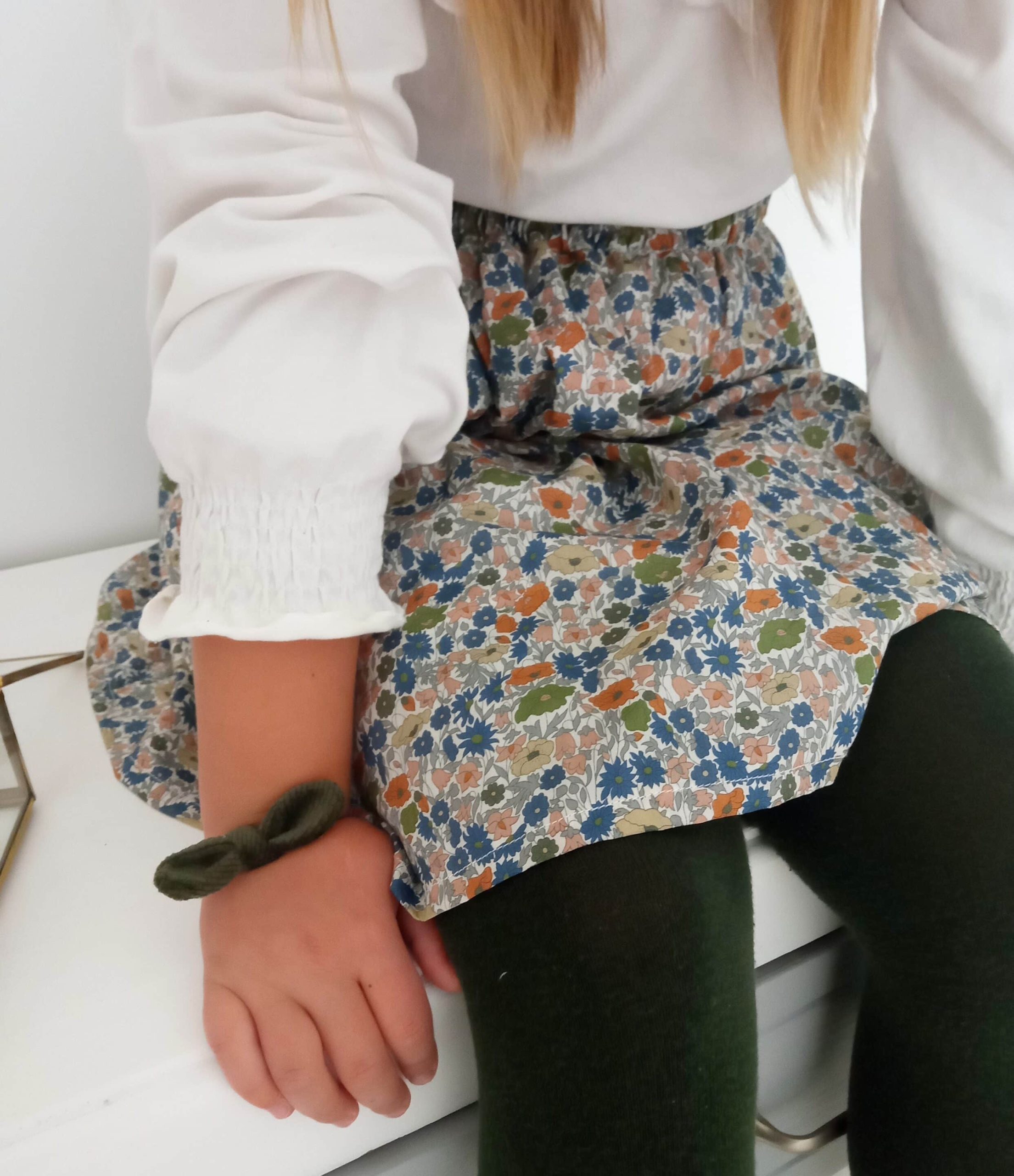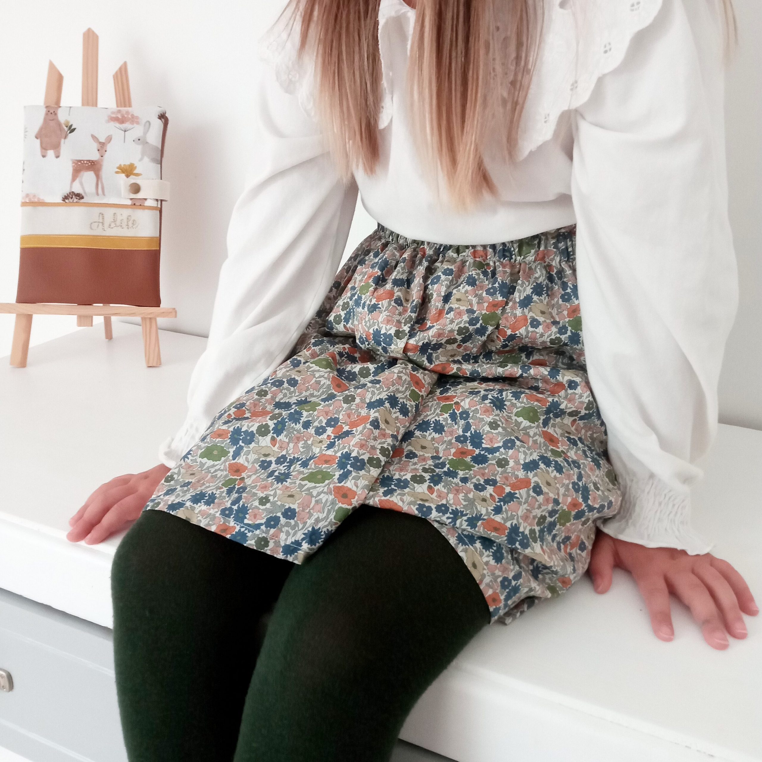 Jupe en liberty; tissu fin et délicat. élastiquée à la taille et doublée par un tissu coton uni.