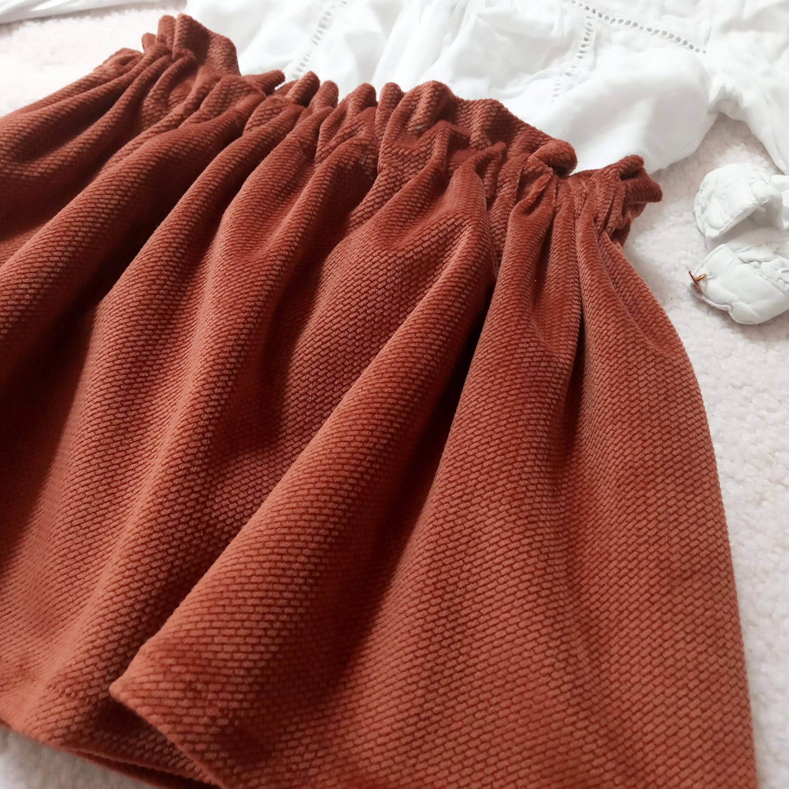Jupe en velours ras élastiquée à la taille et doublée par un tissu coton uni.