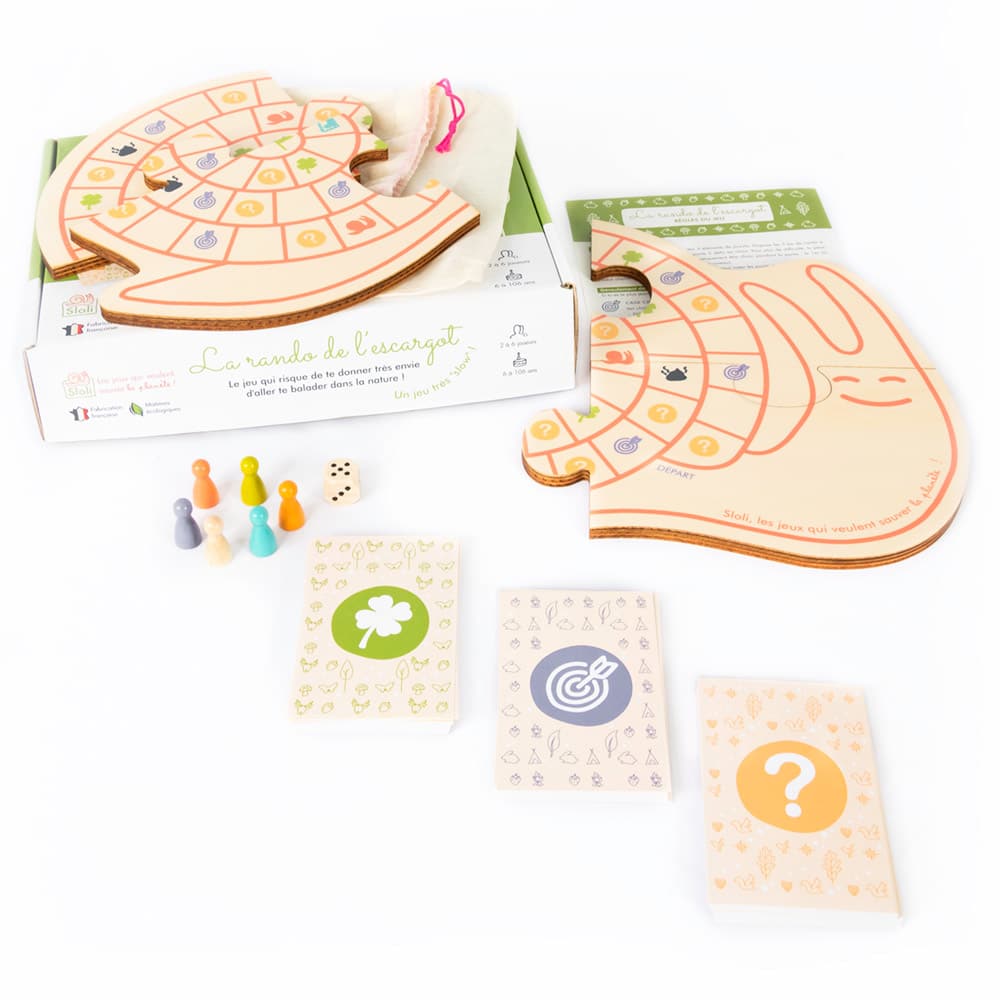 Avec La rando de l’escargot, nous avons choisi de réinventer le traditionnel et indémodable jeu de l’oie en bois. Le résultat donne un savoureux mélange de hasard, stratégie et connaissances. Et un très beau design, avec ce charmant plateau et ces pions produits en bois du Jura, comme tous nos jeux fabriqués en France.