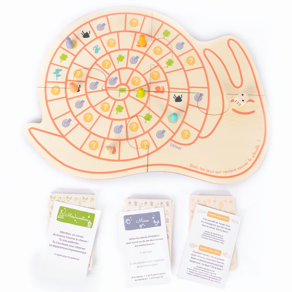 Grâce aux différentes facettes de ce jeu de l’oie ou jeu de l’escargot en bois, les enfants développent donc leurs connaissances autour de la nature et du développement durable, mais aussi leur créativité et leur capacité d’argumentation. De nombreuses recherches ont montré que le fait de jouer est quelque chose d’essentiel pour l’éveil et la construction de l’identité d’un enfant. Cela démarre même tout bébé ! Et chez Sloli, nous sommes convaincus que les meilleurs jeux éducatifs sont ceux qui permettent d’apprendre mais aussi de s’amuser. Nous élaborons toujours avec beaucoup de soin et de rigueur nos jouets et jeux éducatifs. Le but est qu’ils soient ludiques tout en permettant aux enfants de développer un maximum d’aptitudes et de compétences : adresse, motricité fine, concentration, réflexion, imitation, éveil, imagination… Comme dans tous nos jeux pour enfants sur le développement durable et la nature, le principe est d’apprendre et de découvrir tout en s’amusant !