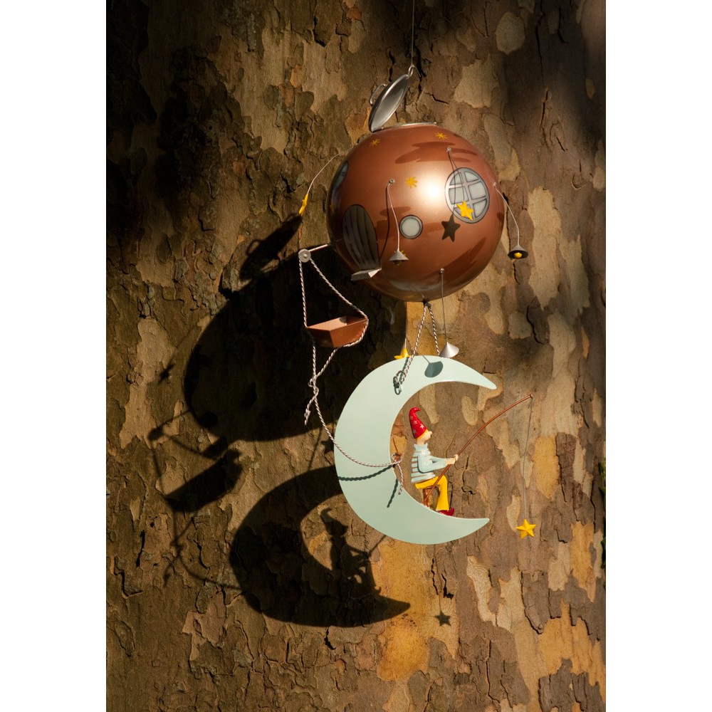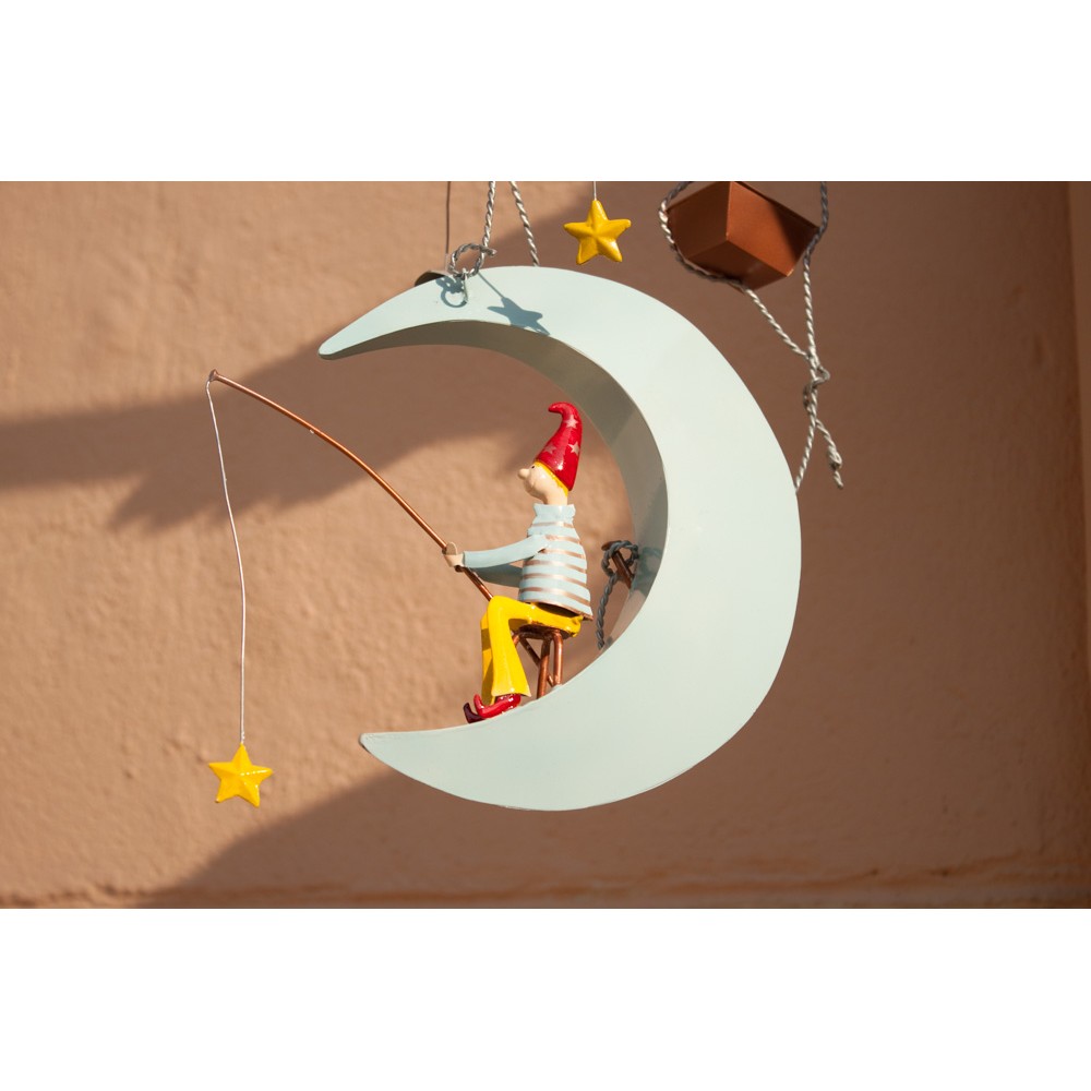 Ce mobile est composé de métal et entièrement peint à la main. Suspendez ce Schlumpeter « La Lune » dans une chambre pour stimuler l’imagination des plus petits. Il est composé d’un elfe qui vit sur sa lune argentée et passe son temps à pêcher des étoiles avant de rentrer dans son vaisseau cuivré tout rond et faire le tour de la terre. L’Oiseau Bateau, créateur de rêves pour les plus petits et les plus grands.