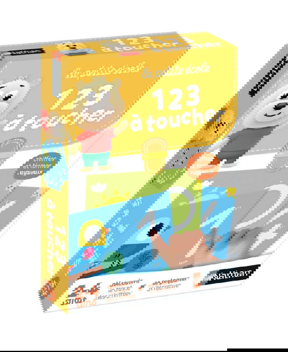 Nathan La Petite École 123 à Toucher est un jeu éducatif tactile qui permet aux enfants de 3 ans et plus de découvrir les chiffres en les traçant avec le doigt. Apprentissage sensoriel et ludique.