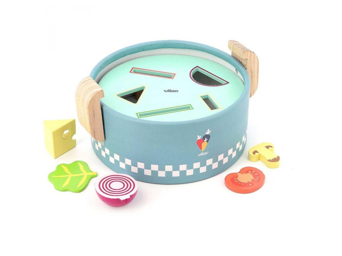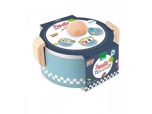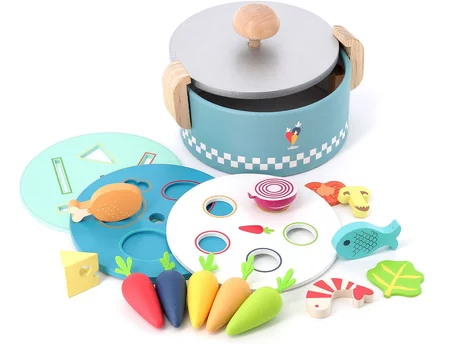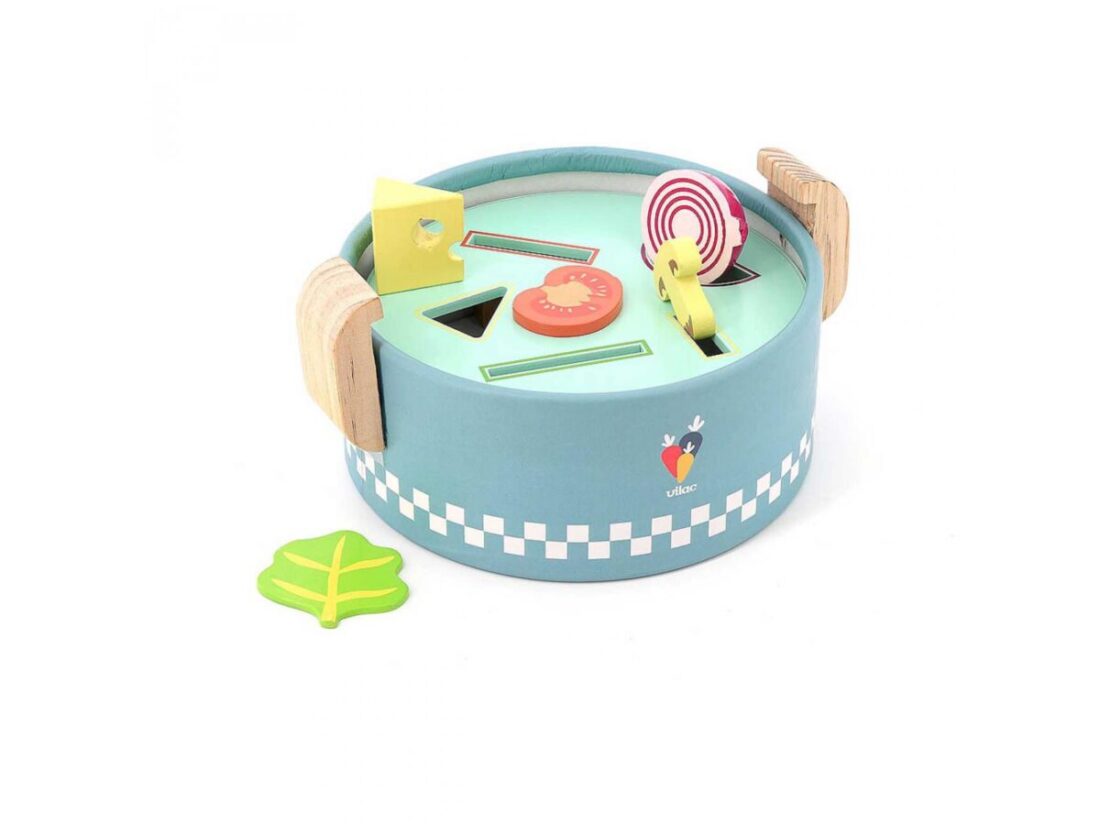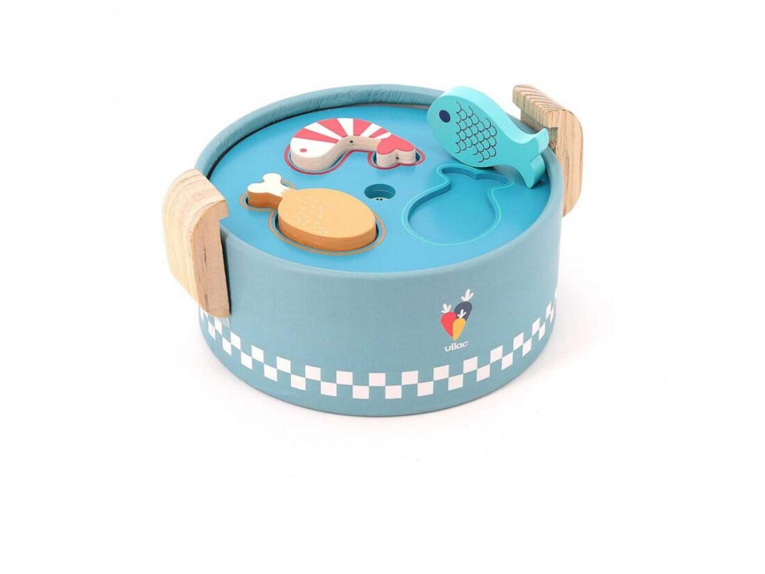 Quelles surprises dans cette popotte minus ! Un jeu d’éveil en forme de popotte pour cuisiner. En dévissant le couvercle, les petits découvrent 3 plateaux d’activité interchangeables : un poisson, du poulet et une crevette à encastrer sur un étage, 5 légumes à glisser dans la forme correspondante dans un autre plateau et enfin 5 petites carottes multicolores à planter suivant leur couleur aux bons emplacements dans le dernier plateau. L’enfant peut ainsi développer son sens de l’observation, exercer sa motricité tout en s’amusant à faire comme les grands, ça sent bon chef ! • Une popote. • Un couvercle…