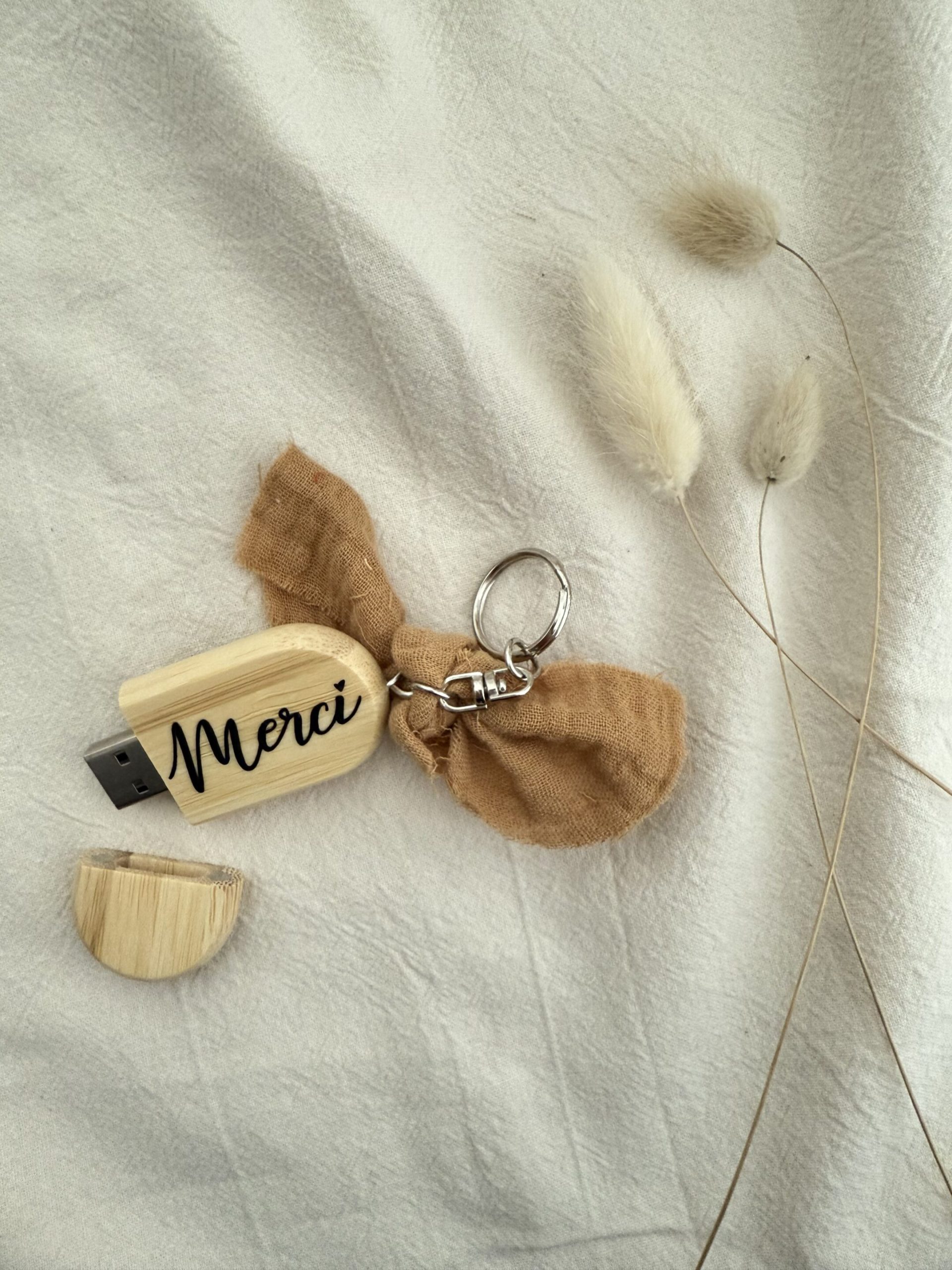 Ce joli petit porte clés en bois est le petit cadeau parfait car il se rendra très utile voire même indispensable grâce à sa clé usb. A offrir « vide » pour remercier les maitresses en fin d’année ou à offrir avec de jolies vidéos ou photos lors d’un mariage ou d’un anniversaire… Personnalisable avec le petit mot ou prénom de votre choix, il ajoutera à cette clé une valeur sentimentale <3