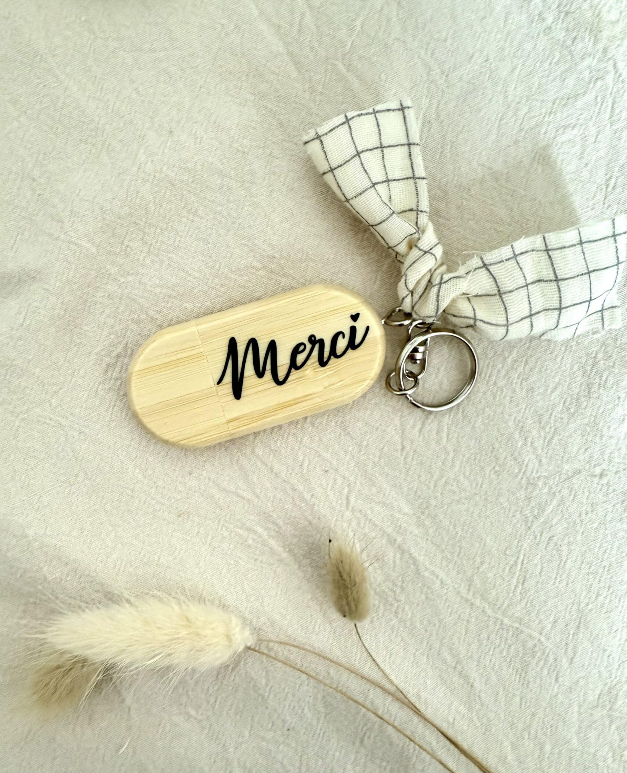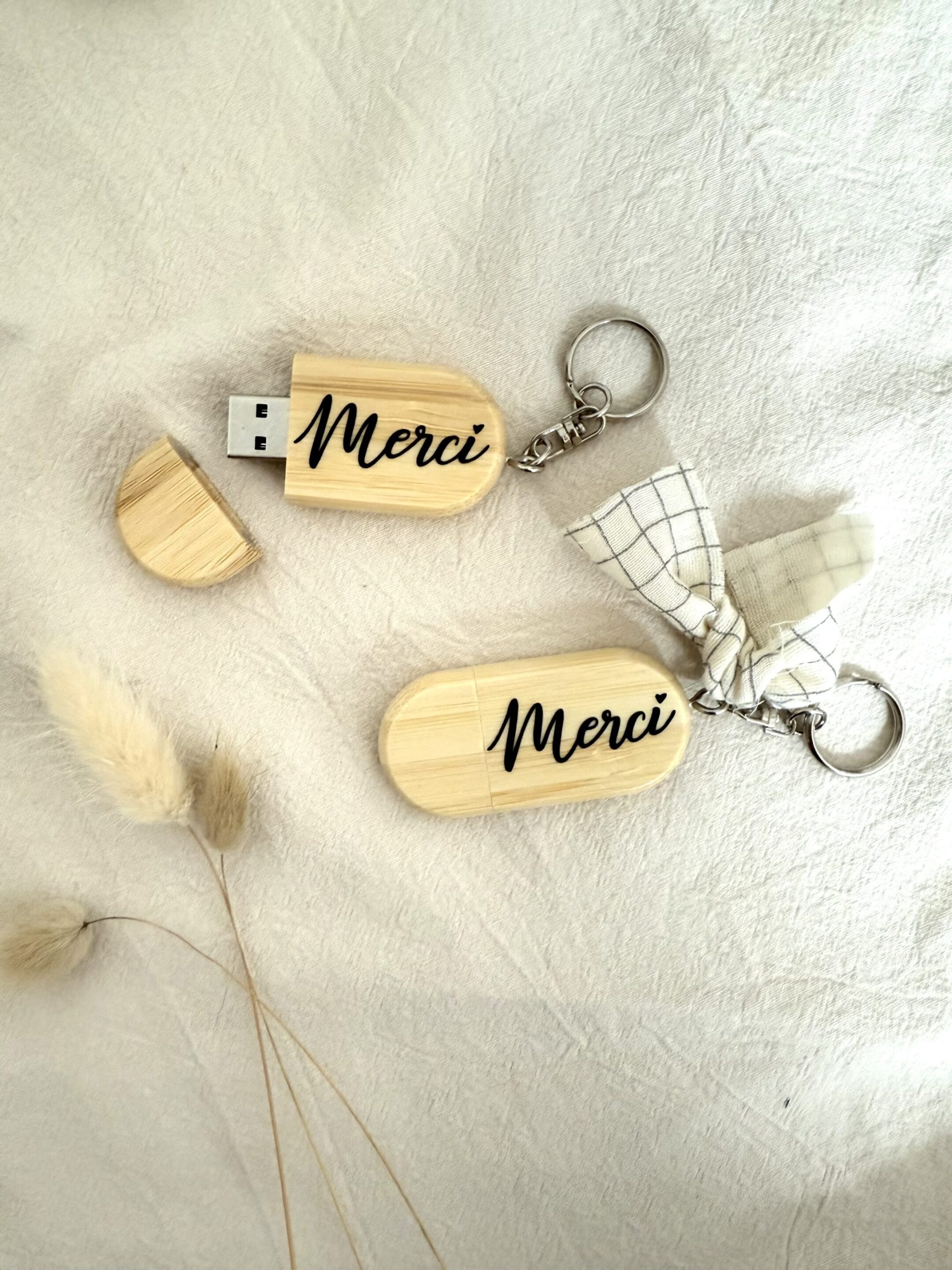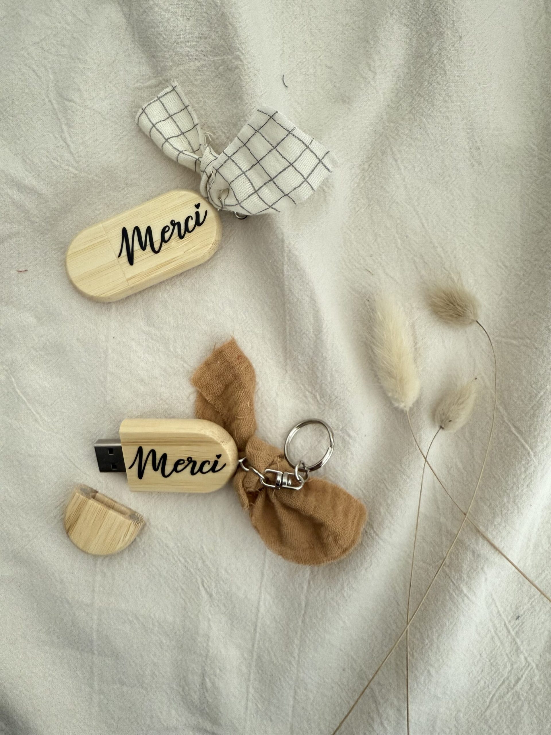 Ce joli petit porte clés en bois est le petit cadeau parfait car il se rendra très utile voire même indispensable grâce à sa clé usb. A offrir « vide » pour remercier les maitresses en fin d’année ou à offrir avec de jolies vidéos ou photos lors d’un mariage ou d’un anniversaire… Personnalisable avec le petit mot ou prénom de votre choix, il ajoutera à cette clé une valeur sentimentale <3