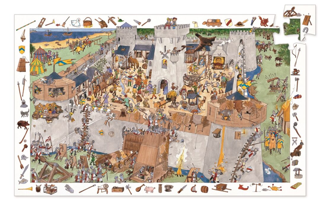 Un bel univers de chevaliers à découvrir dans ce puzzle d’observation Le château fort de 100 pièces de Djeco riche en détails et en surprises. Votre enfant va créer son puzzle puis retrouver dans l’image les éléments de la frise pour se plonger dans les détails de l’assaut de ce château ! Il pourra également accrocher le poster du puzzle au mur de sa chambre. Une très belle idée de cadeau ludique et éducative pour les enfants ! Dimension du puzzle: 61 x 38 cm