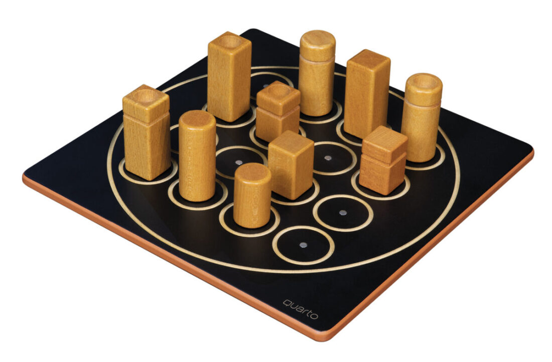 L’objectif : aligner 4 pièces ayant au moins un point commun entre elles. Mais ne croyez pas que vous jouerez celles que vous voudrez : c’est l’adversaire qui choisit pour vous ! Les seize pièces du jeu, toutes différentes, possèdent chacune 4 caractères distincts : haute ou basse, ronde ou carrée, rainurée ou lisse, pleine ou creuse. Chacun à son tour choisit et donne une pièce à l’adversaire, qui doit la jouer sur une case libre. Le gagnant est celui qui, avec une pièce reçue, crée un alignement de 4 pièces ayant au moins un caractère commun et annonce :…