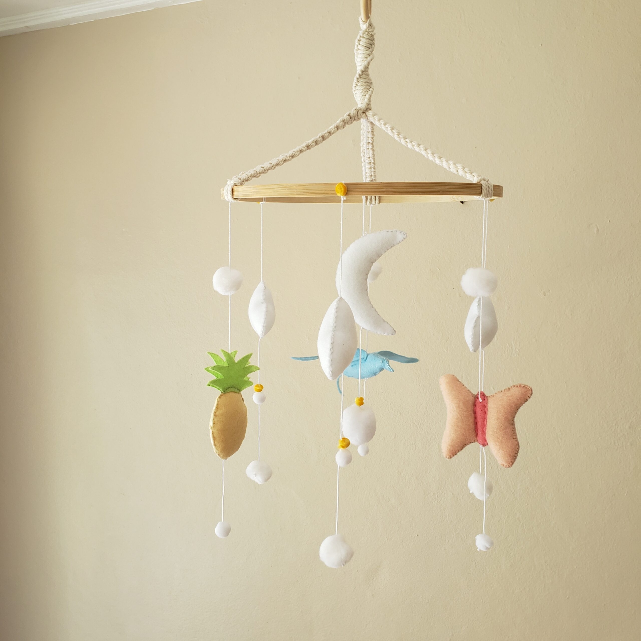 Mobile bébé pour berceau fabriqué à la main avec soin et amour. Thématique TROPICAL pour des doux rêves de La Réunion comprenant: