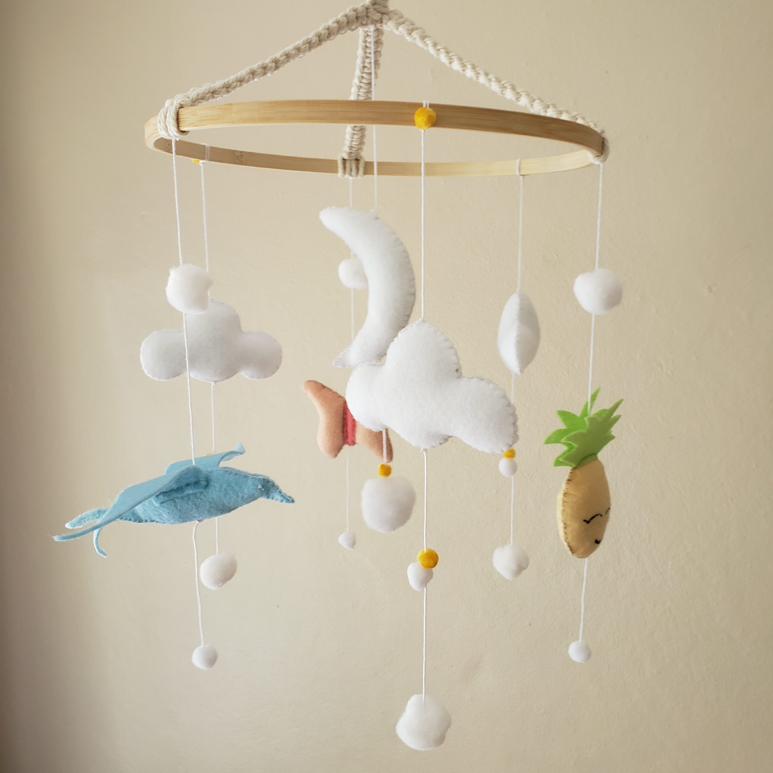 - Fils de laine blanche, corde de macramé 100% coton beige, et matériau en feutre doux pour les éléments. Rembourrage en polyester (fait de matière recyclée, hypoallergénique et lavable).